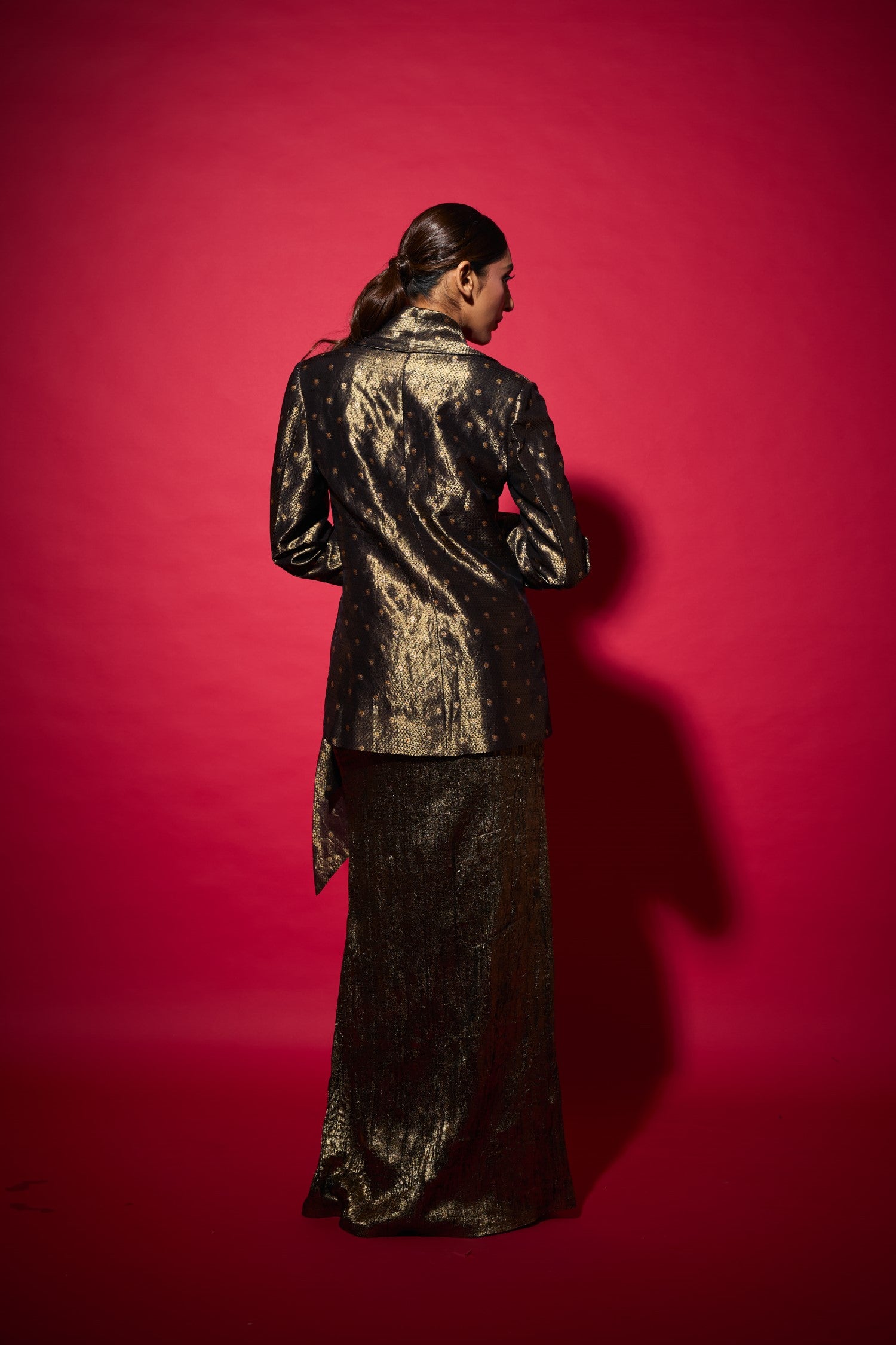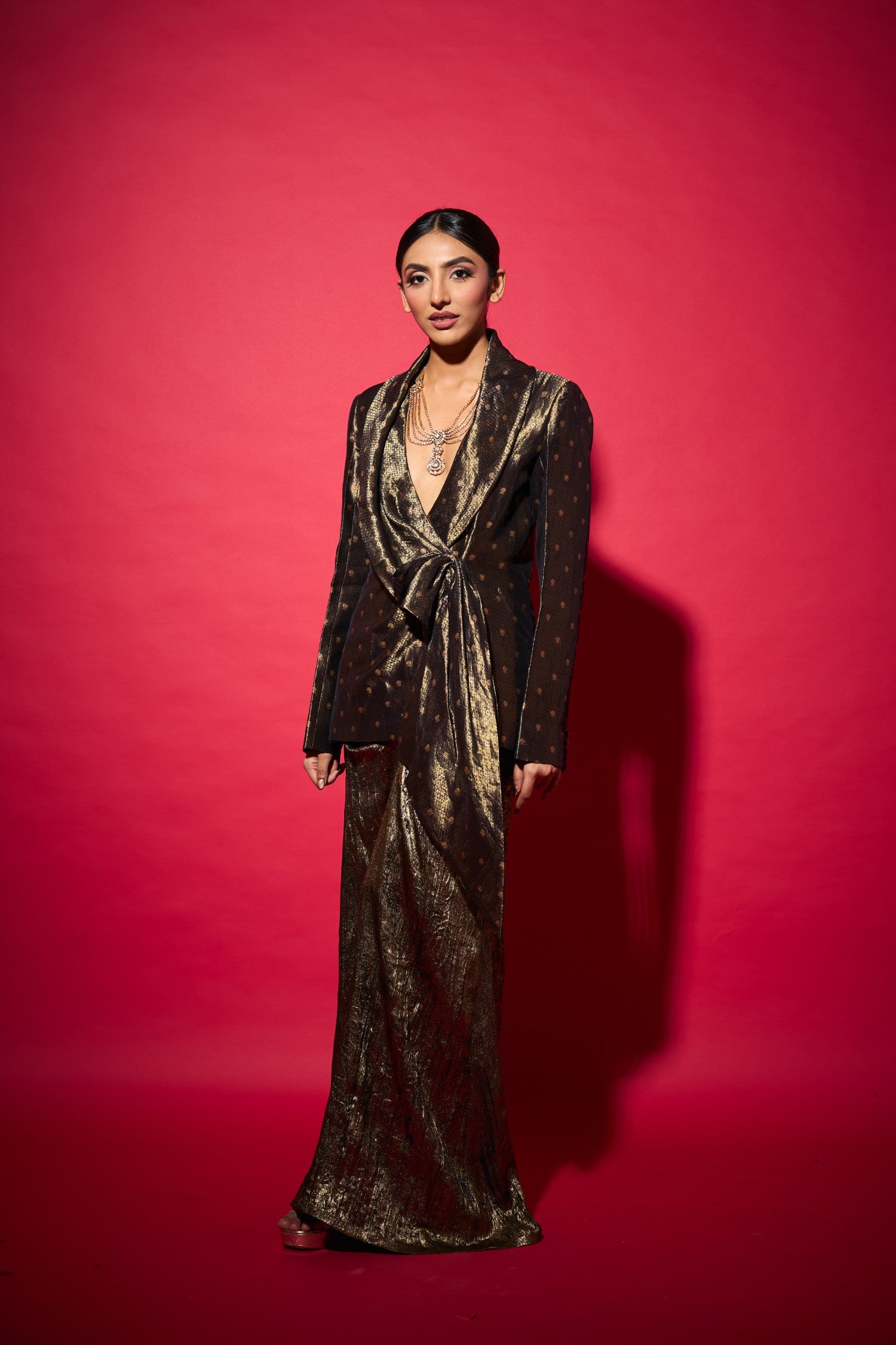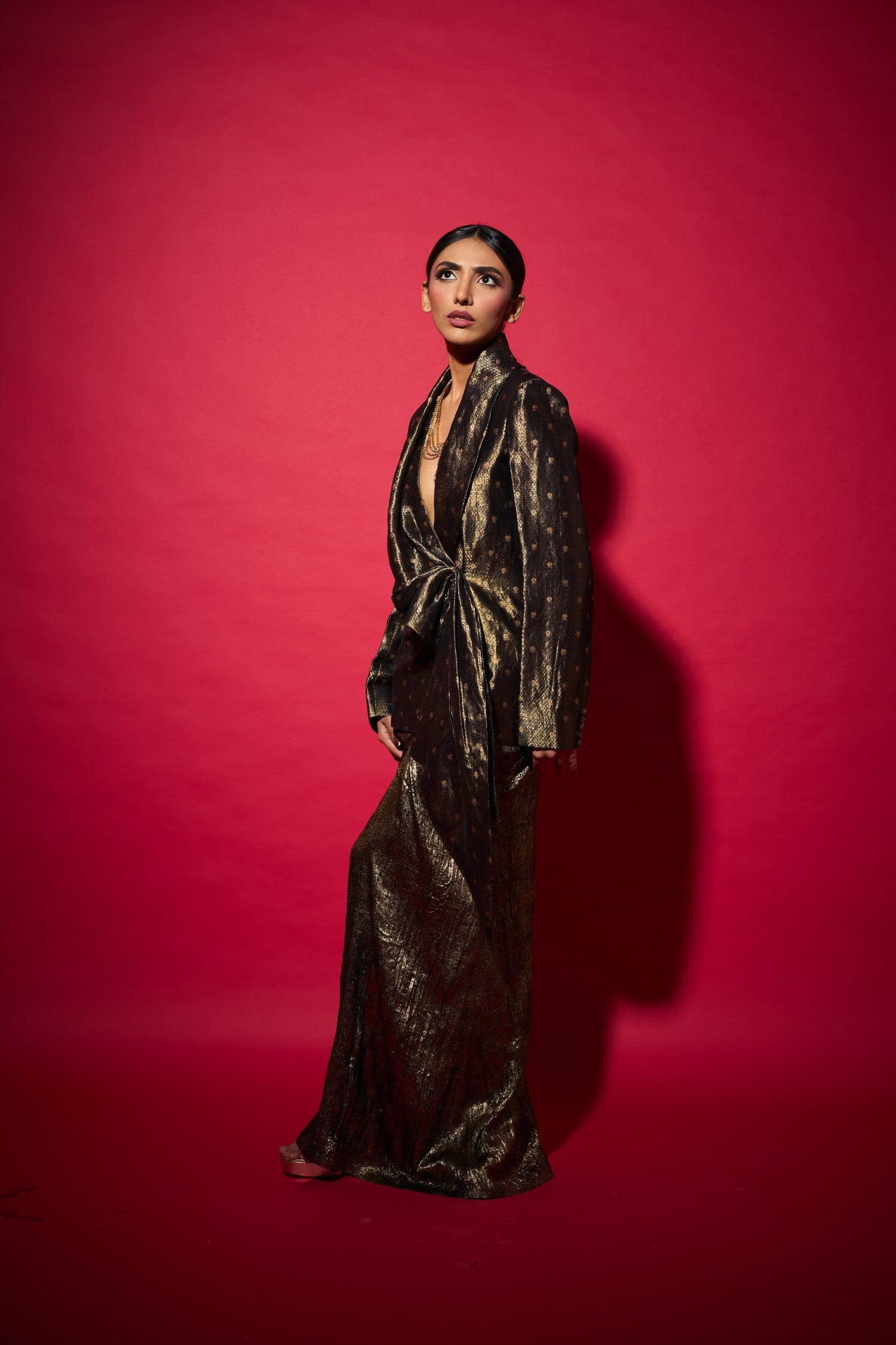 Sejal Kamdar: Sejal Kamdar's designs, featuring a variety of luxurious and handcrafted outfits such as jackets, lehengas, jumpsuits, dresses, and gowns, many of which showcase the intricate Ajrakh embroidery technique.