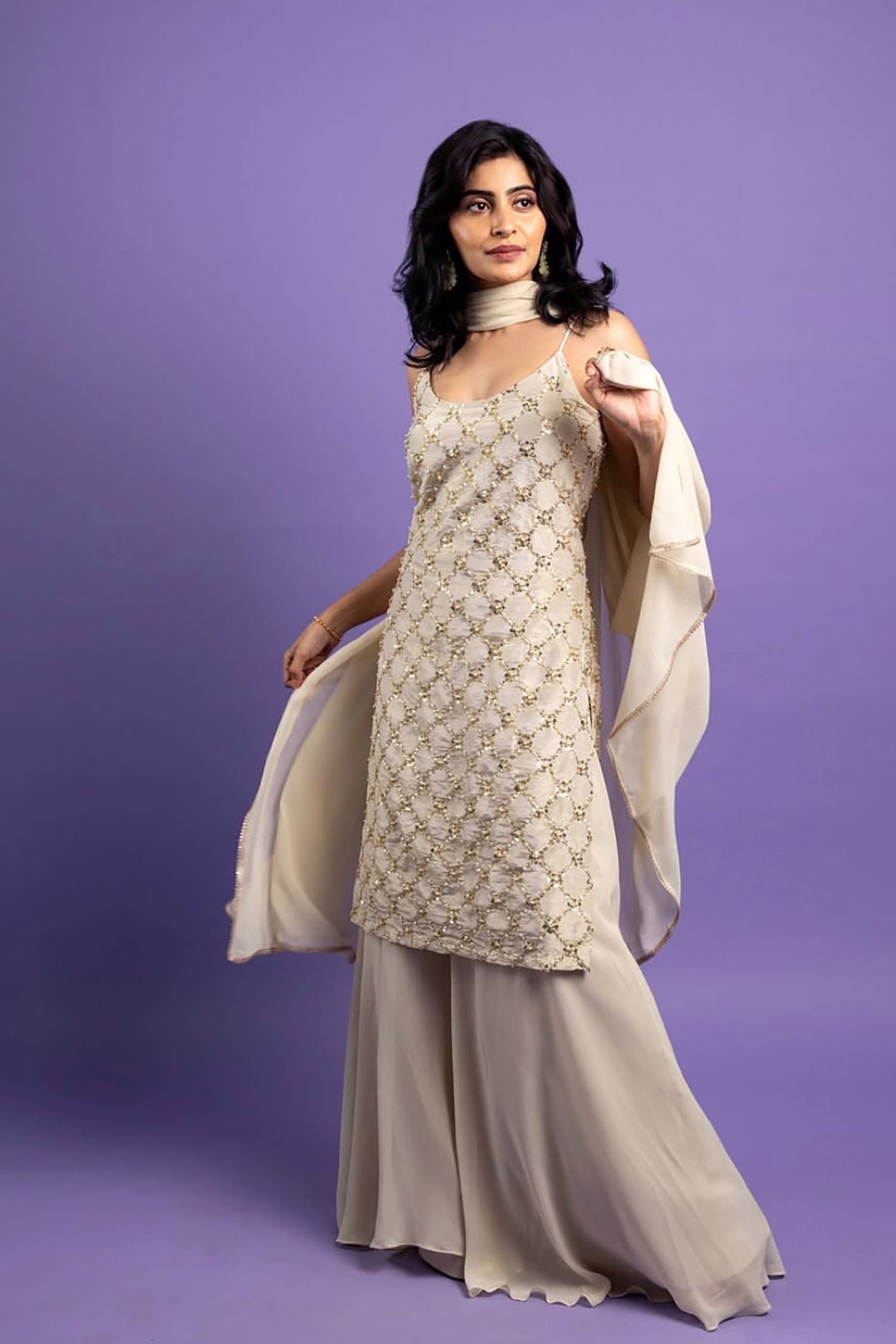 The Shararas suit for Diwali gives a playful, young vibe. Kurtis with embellishments and flared bottoms have a fun yet festive appearance. When you want style without sacrificing comfort, sharara for diwali are ideal for extended rituals.