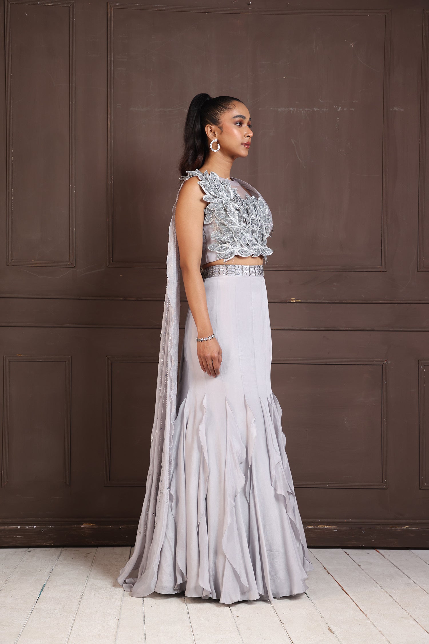 Shine glamorously with this flawless piece of silver. Featuring delicate petal embellishments, this modern silver engagement lehenga design is ideal for evening events where glamour and glitz steal the show.