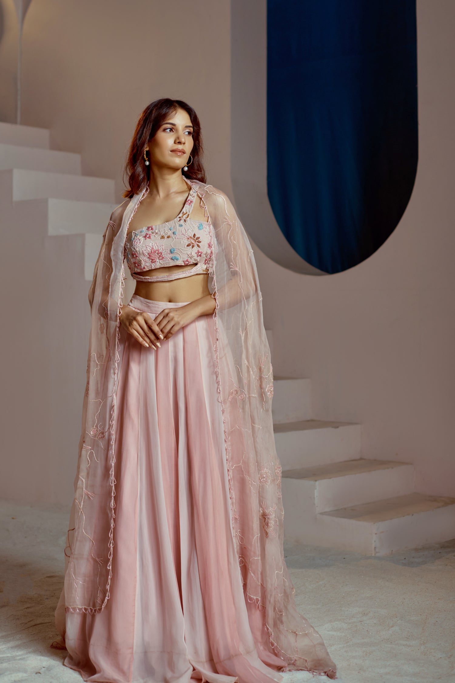 This gorgeous pastel colored, light pink engagement lehenga is ideal for brides who appreciate subtle elegance. It is perfect for ceremonies during the day or garden parties because of its elaborate embroidery and flowing silhouette.