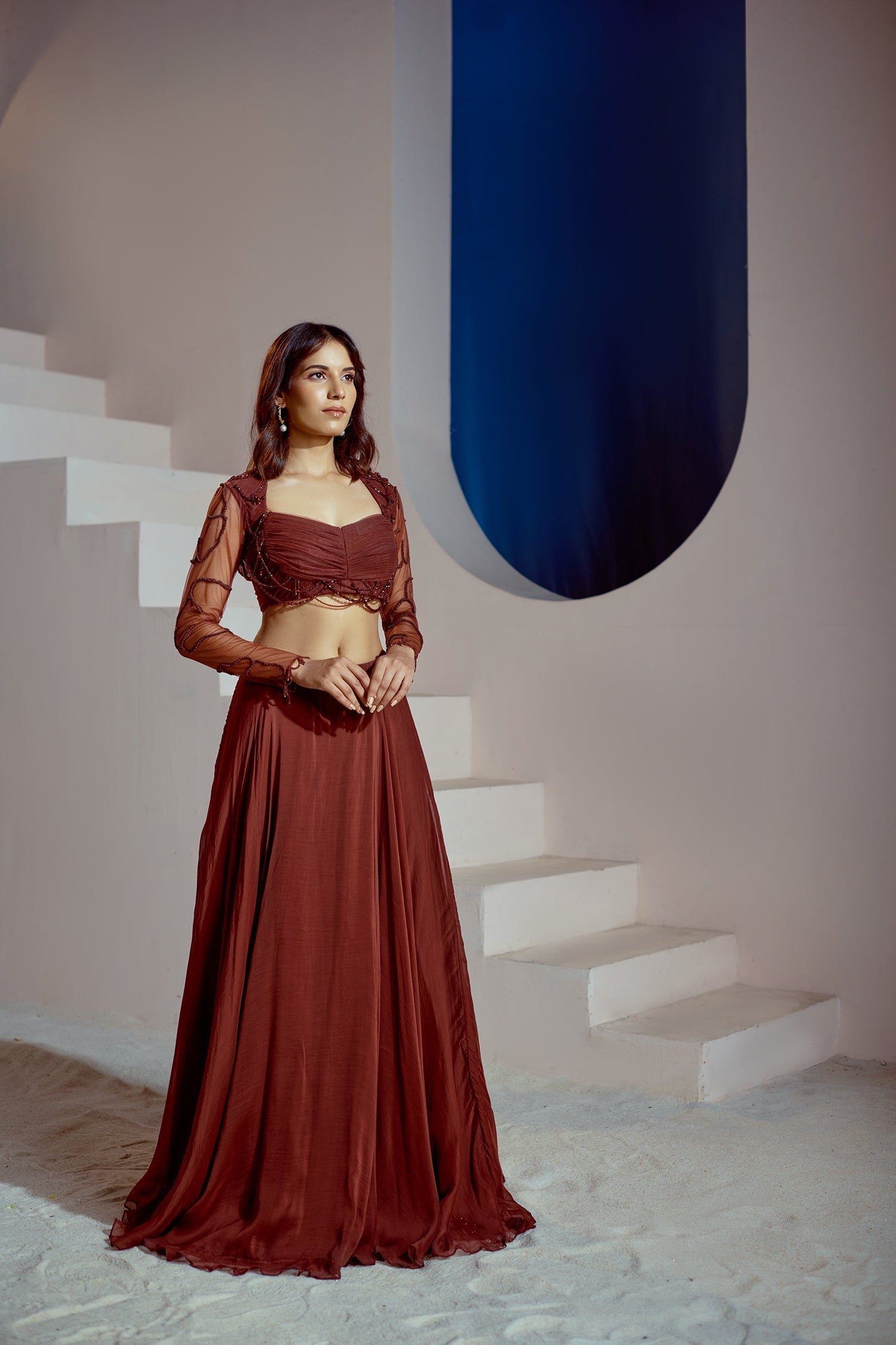 A special engagement lehenga in earthy tones for a bride who enjoys making a statement. This Brown Lehenga Set is a bold yet elegant choice because of the deep brown color and golden accents, which add a regal charm.