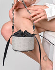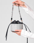 This season’s must-have sliver bag, Cairo presents an elliptic cylinder-shaped design that is sure to complement any outfit. Crafted from crystal mesh and satin fabric, that is spacious enough to store all your daily essentials. It features our signature branded logo along the back and a beaded chain handle to complete the circular shape.