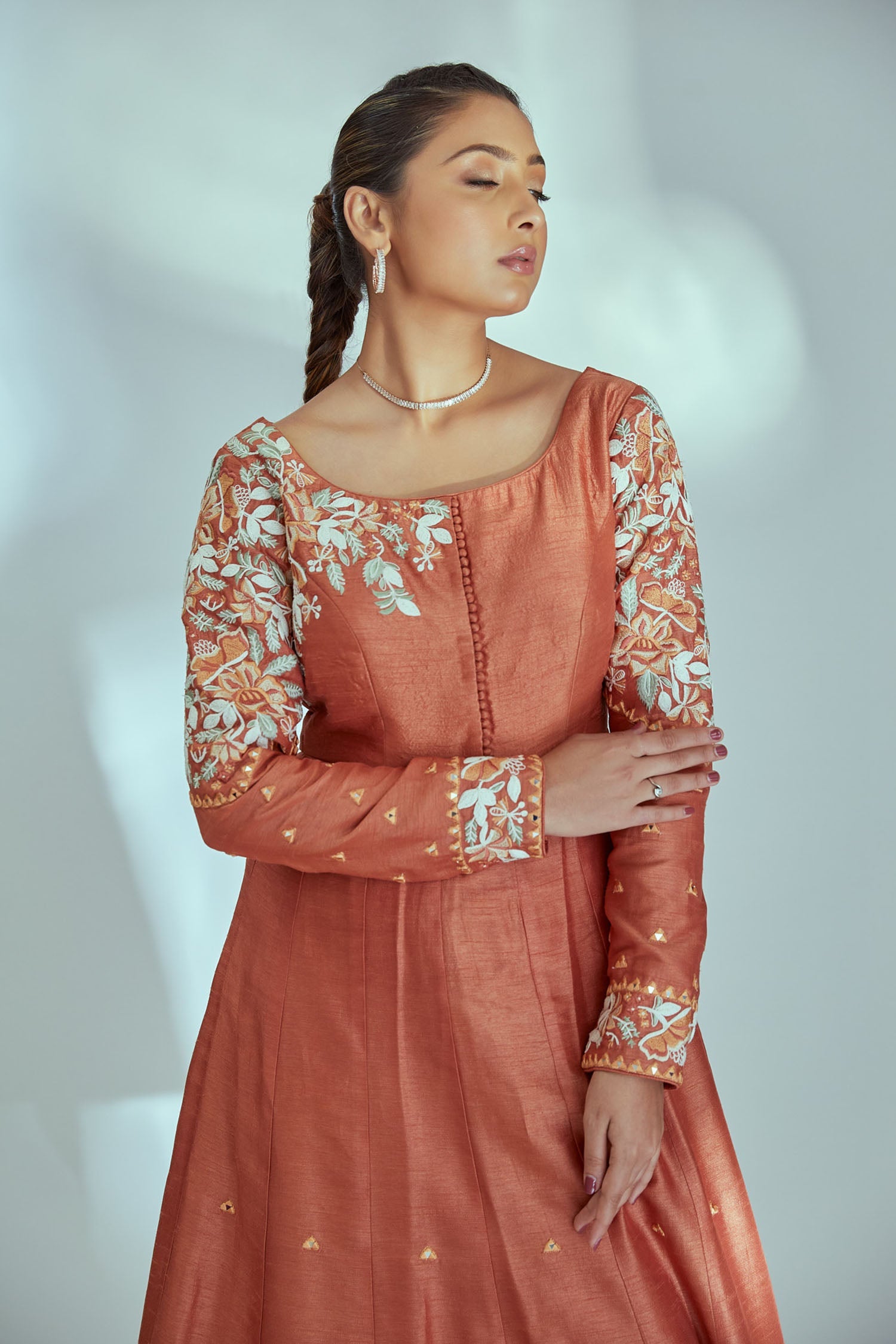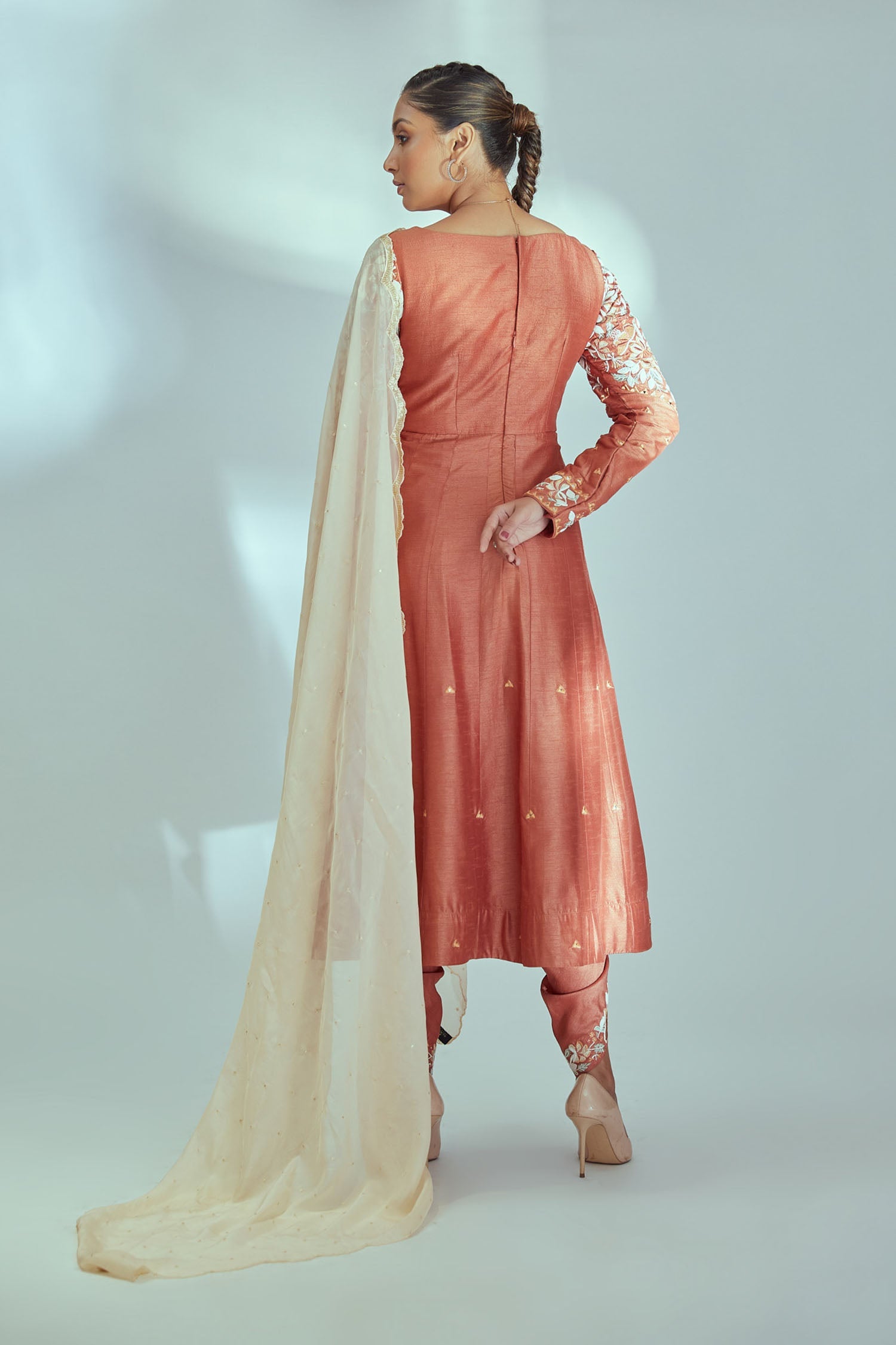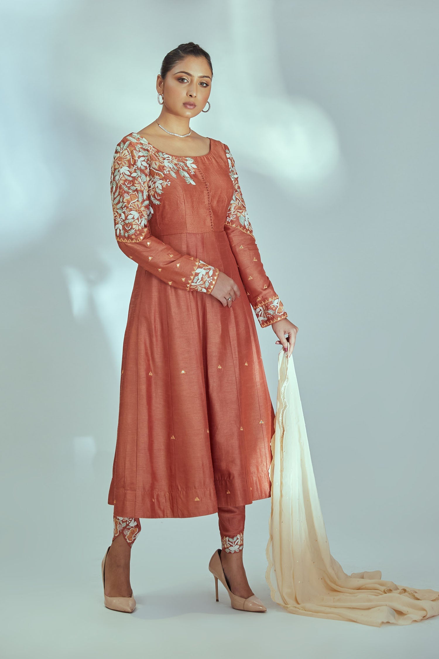 Hand Embroidered Anarkali with Elephant Arch Sleeves and Bandhani Dupatta