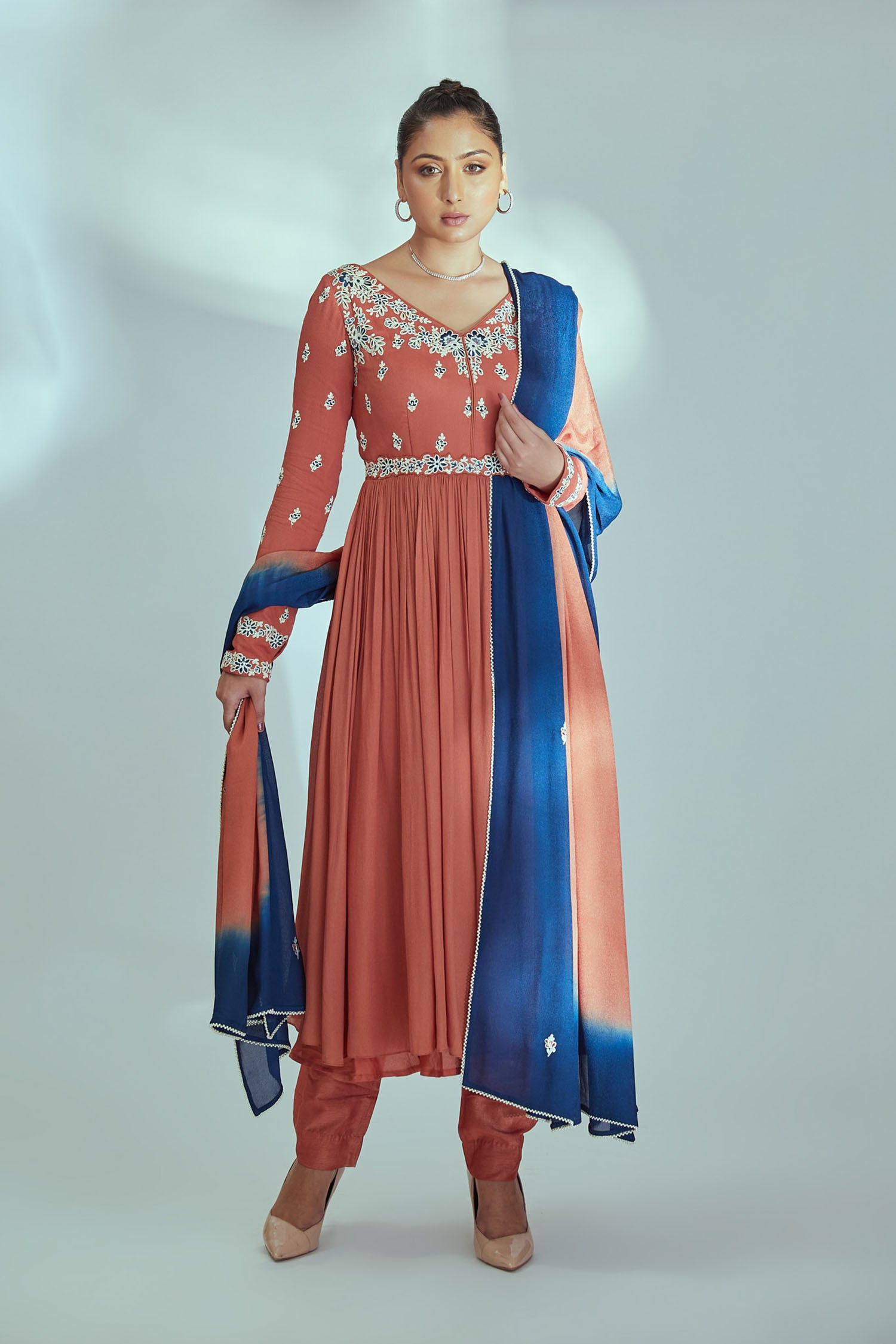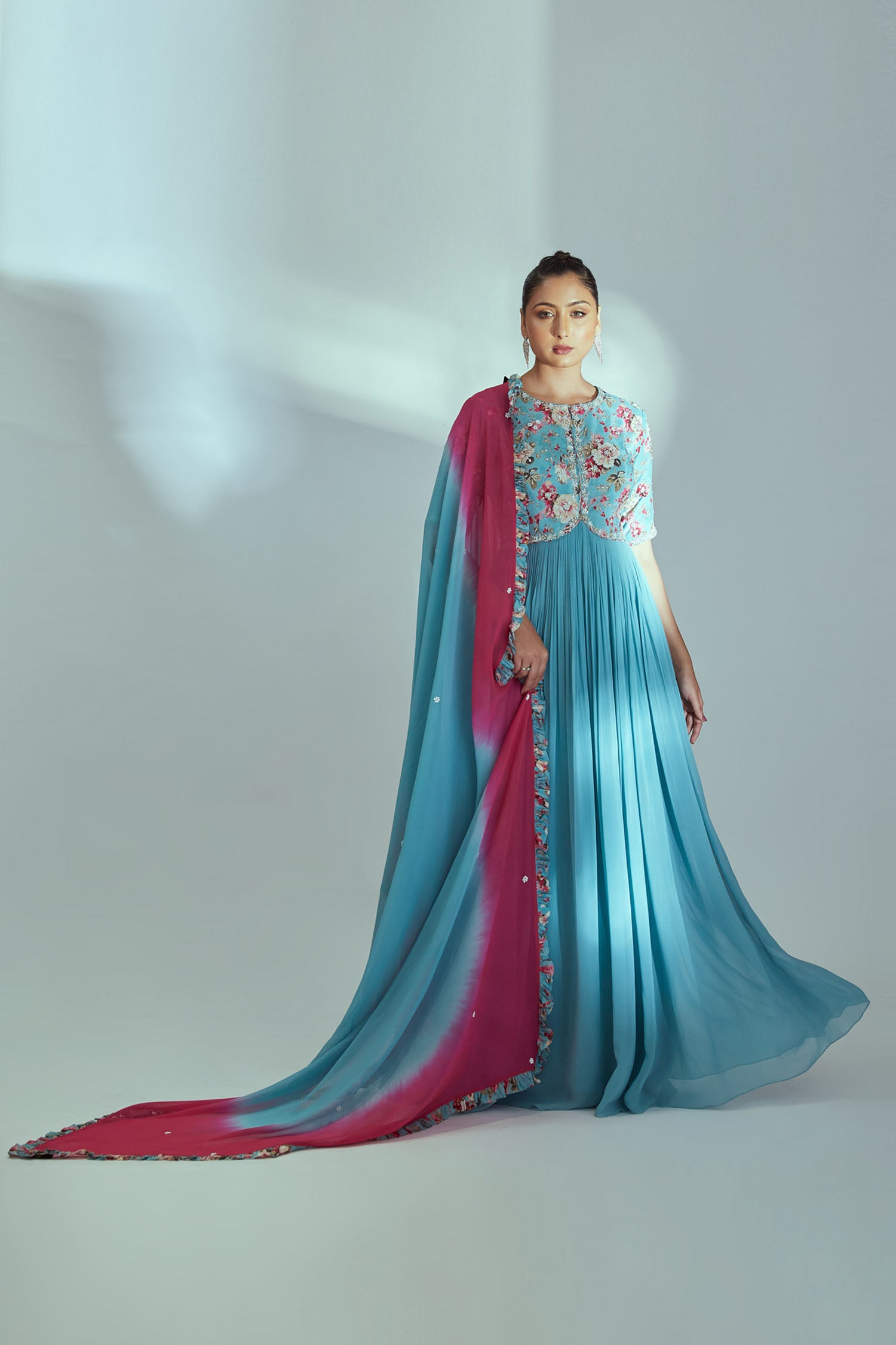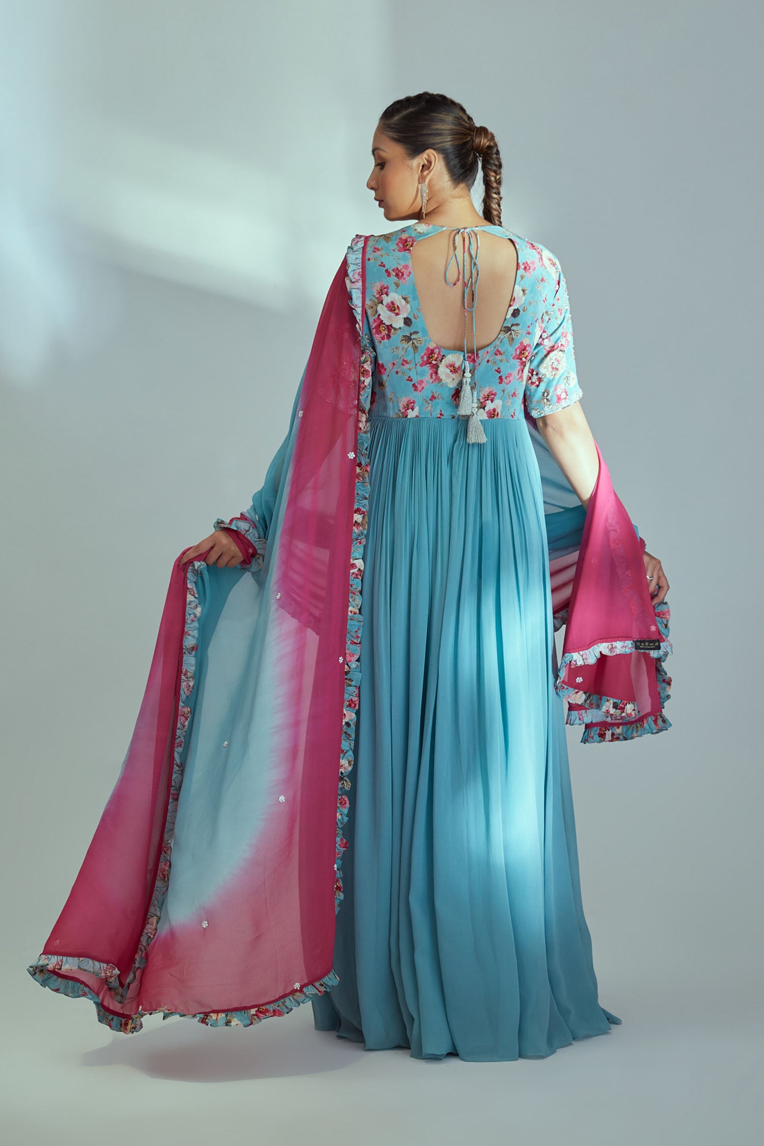 Intricately Sequin Embroidered Light Blue and Coral Red Anarkali with Ombre Pleated Flare