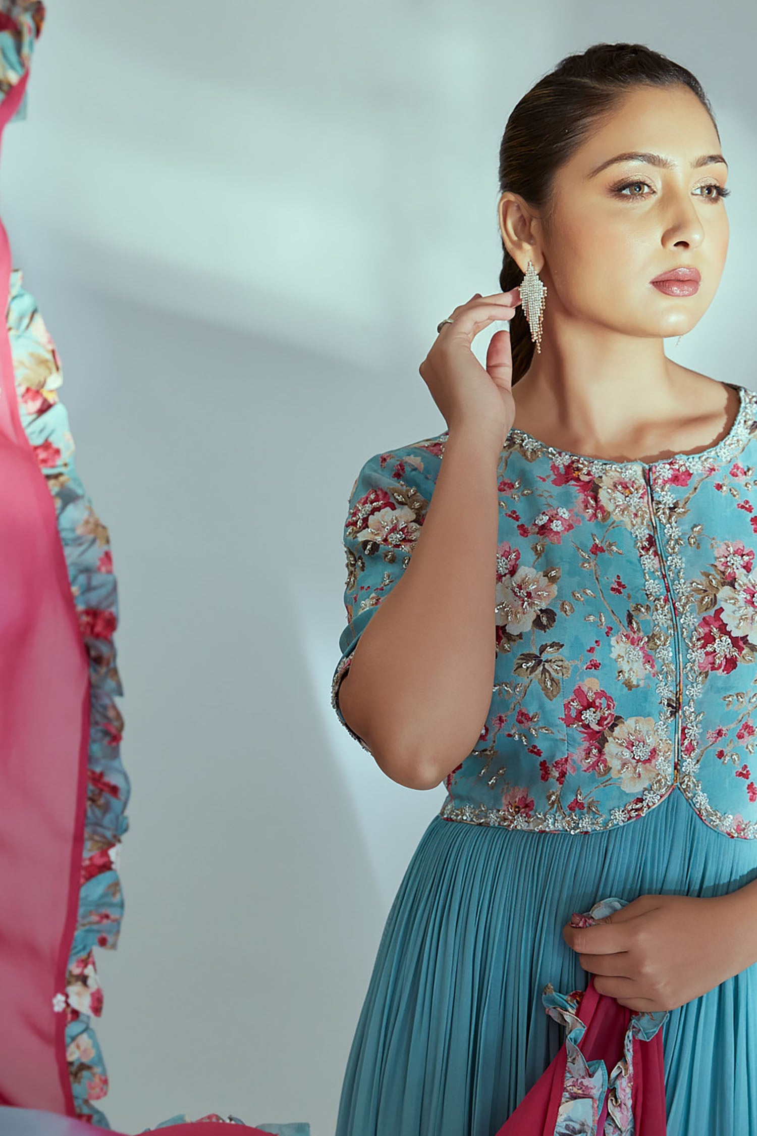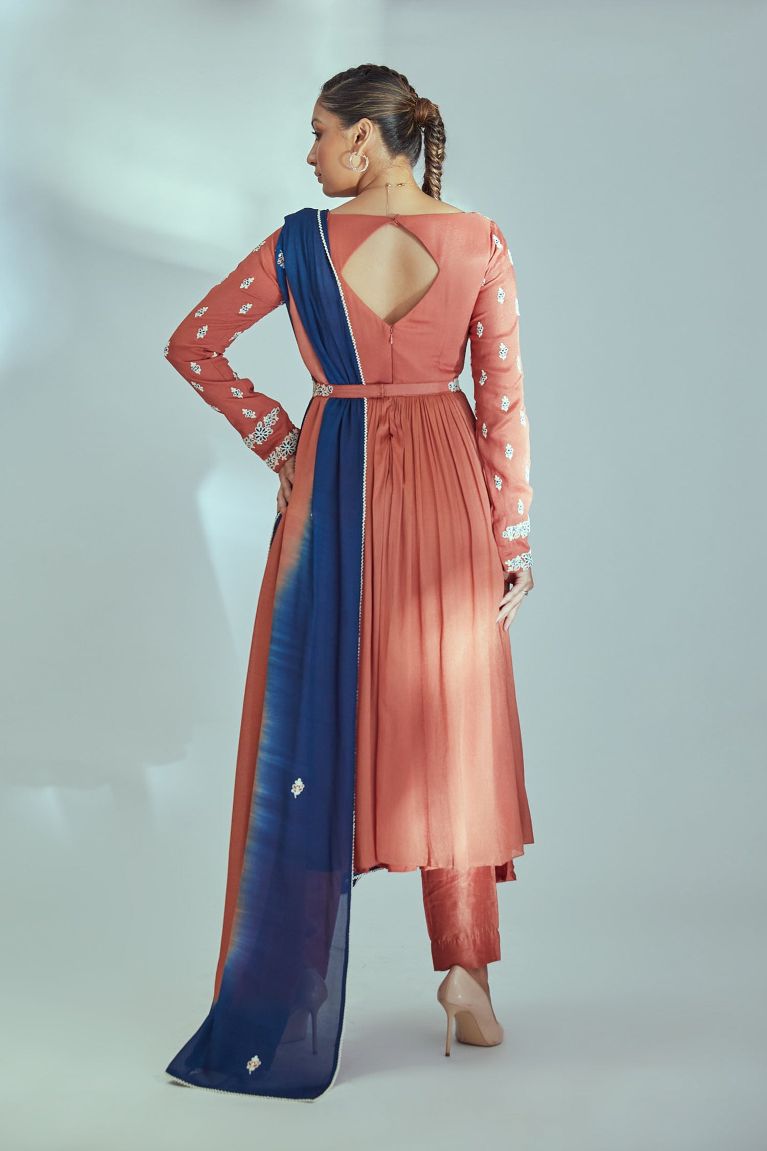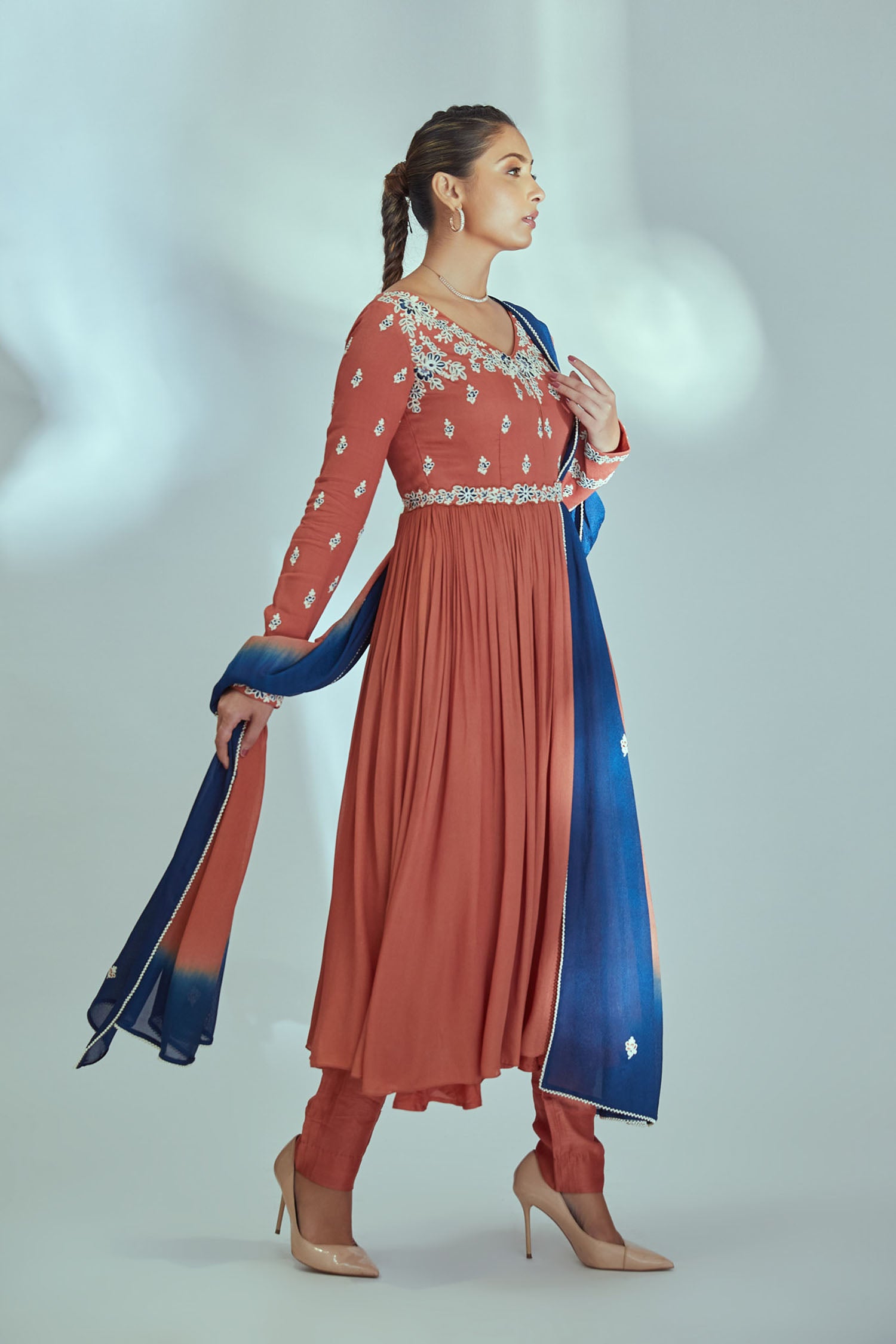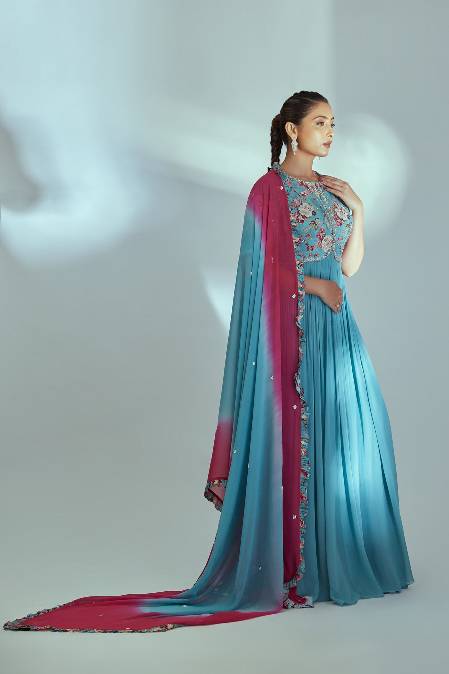 Intricately Sequin Embroidered Light Blue and Coral Red Anarkali with Ombre Pleated Flare