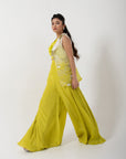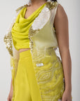 Look No Further Than This Ombre Jacket Featuring a Sequinned Collar. This Set Comes With Lime Colored Flared Pants With Gathers at the Side and a Matching Cowl Top.