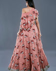 Exquisite embroidered french rose organza lehenga detailed with delicate contrast border at the hem, ,with super chic Offshoulder 3 layered cape with cutwork detailing.