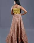 This perfect blend of Indo western outfit gives perfect destination wedding vibes with a palazzo and a printed half patola skirt teamed with a gorgeous blouse finished with scallop details! (Set Of -2)