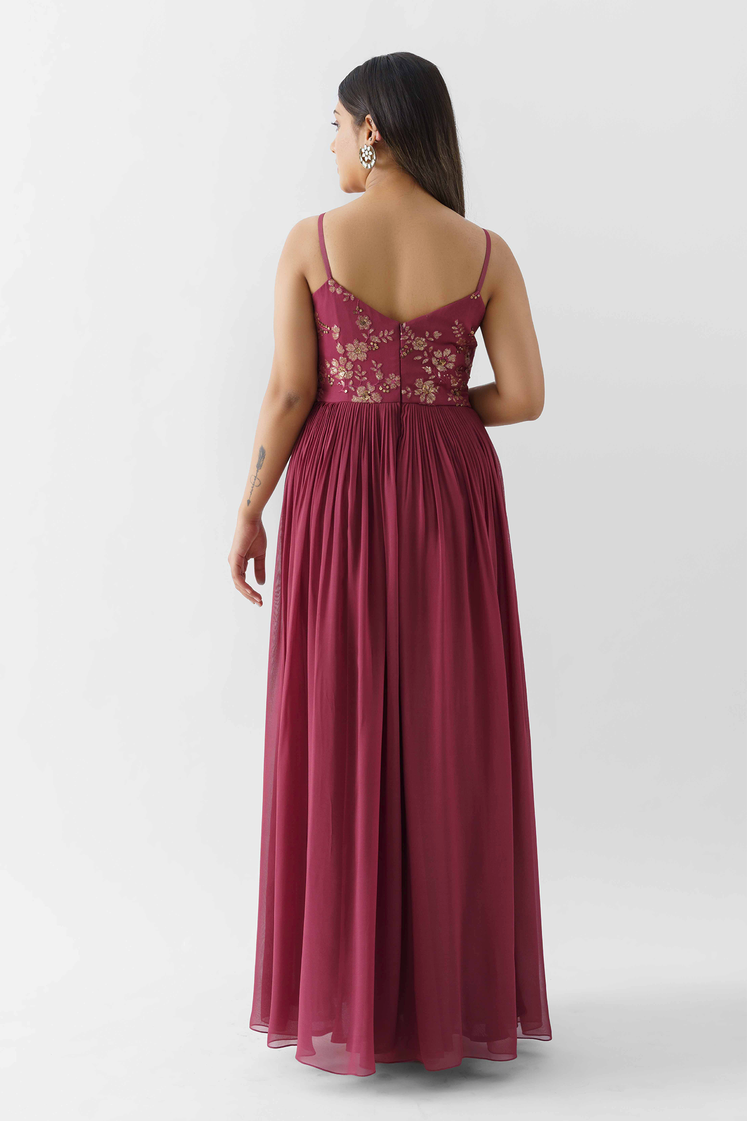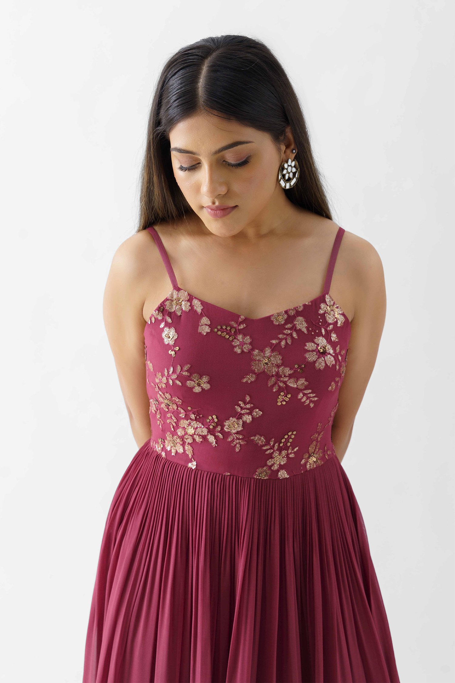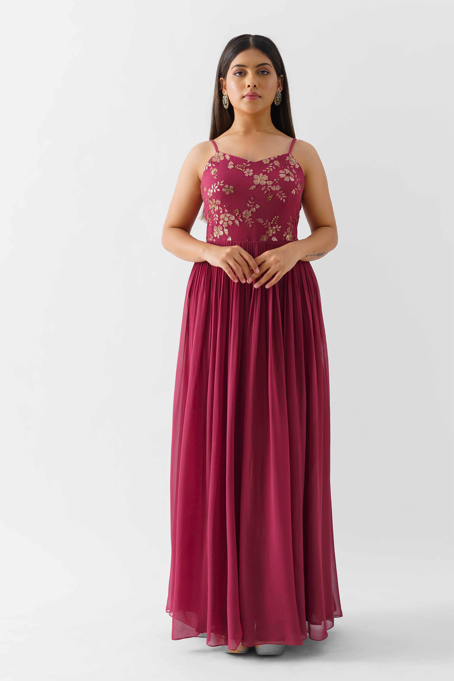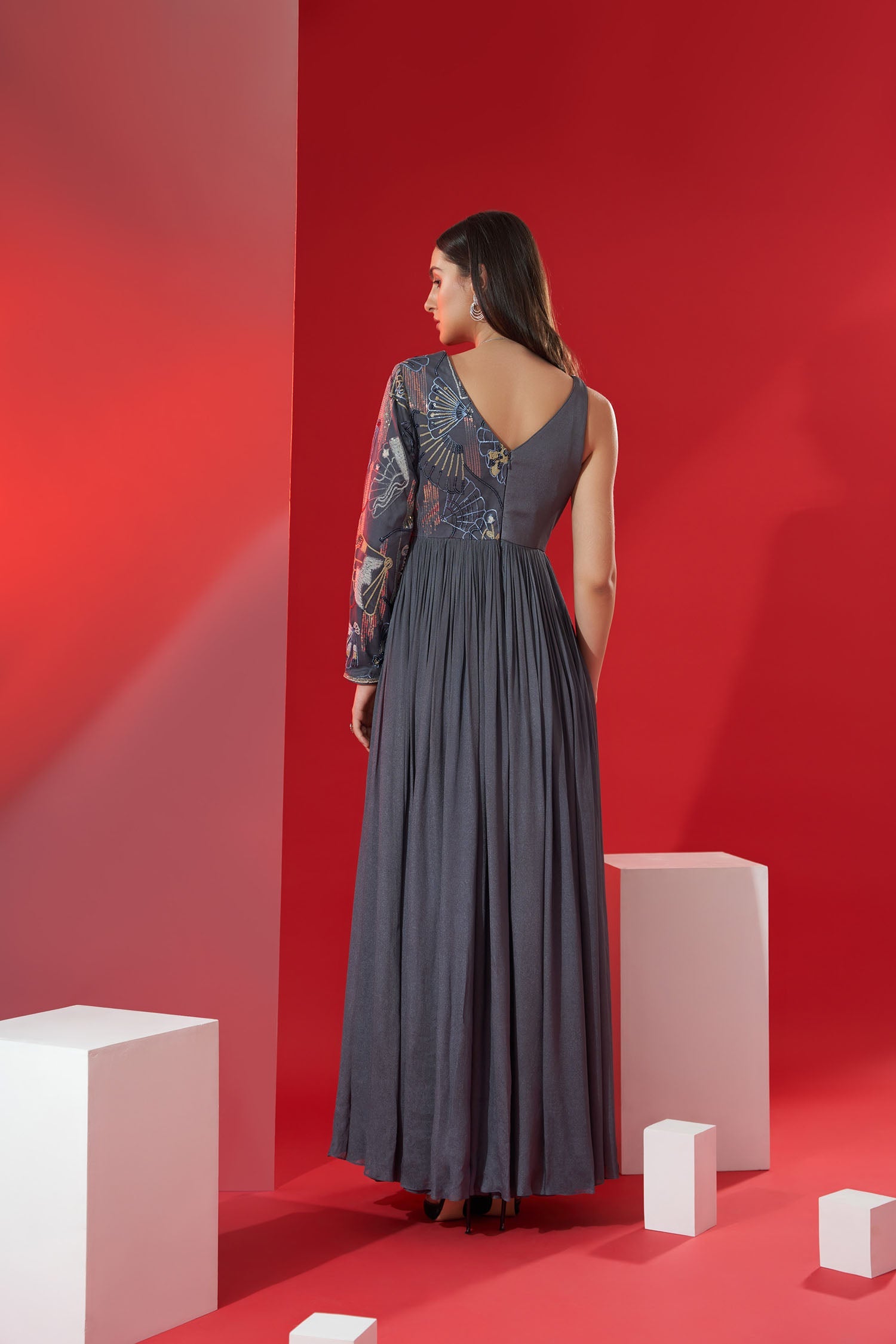 - Gown-Style Indo Western Dresses – Perfect for weddings and evening parties, these dresses feature floor-length silhouettes with traditional embroidery.
