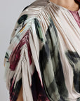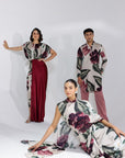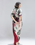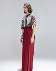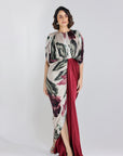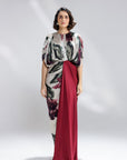 Inspired by the vibrant hues of Phulang Malai, this classy gown is crafted in Georgette satin. It fits slim through the waist before falling into an asymmetric drape. The hand-draped bodice is framed by gathering the fabric and the contrast drape falls at the bottom adding a lovely pop of color to the gown.