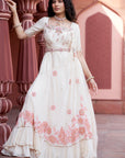 Full length gown along with a beatifully tissue flowered embroidery cape. Comes along with belt and neck piece