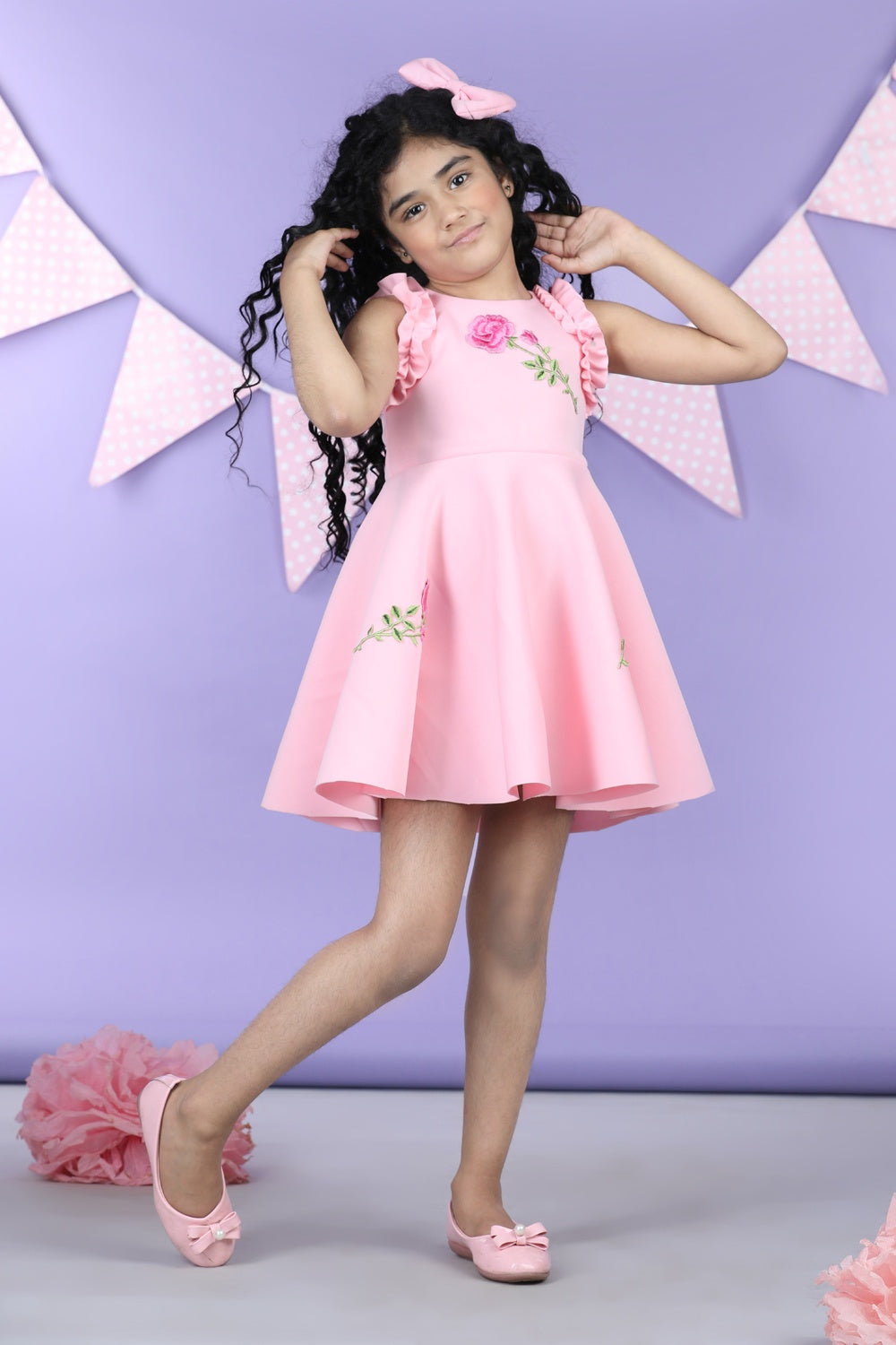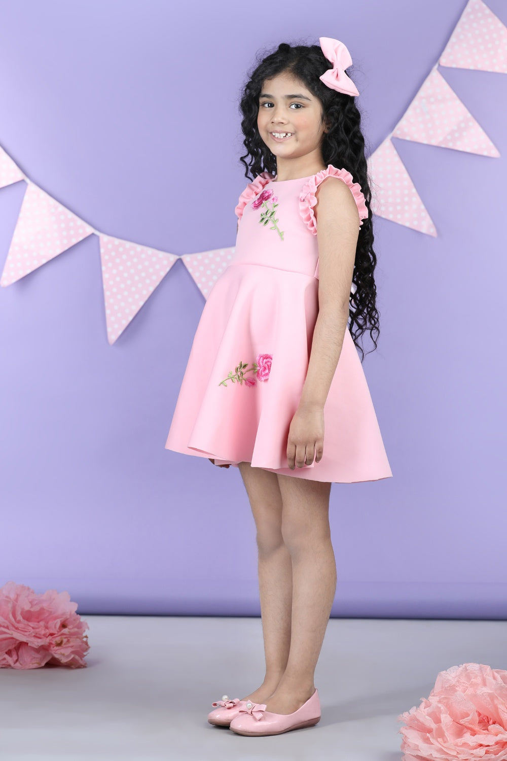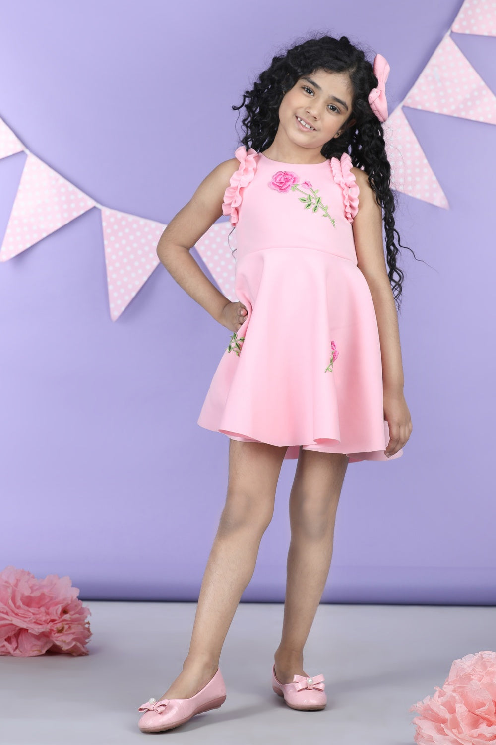 Dress with Embroiderd Flower Patches and Frill On Armhole