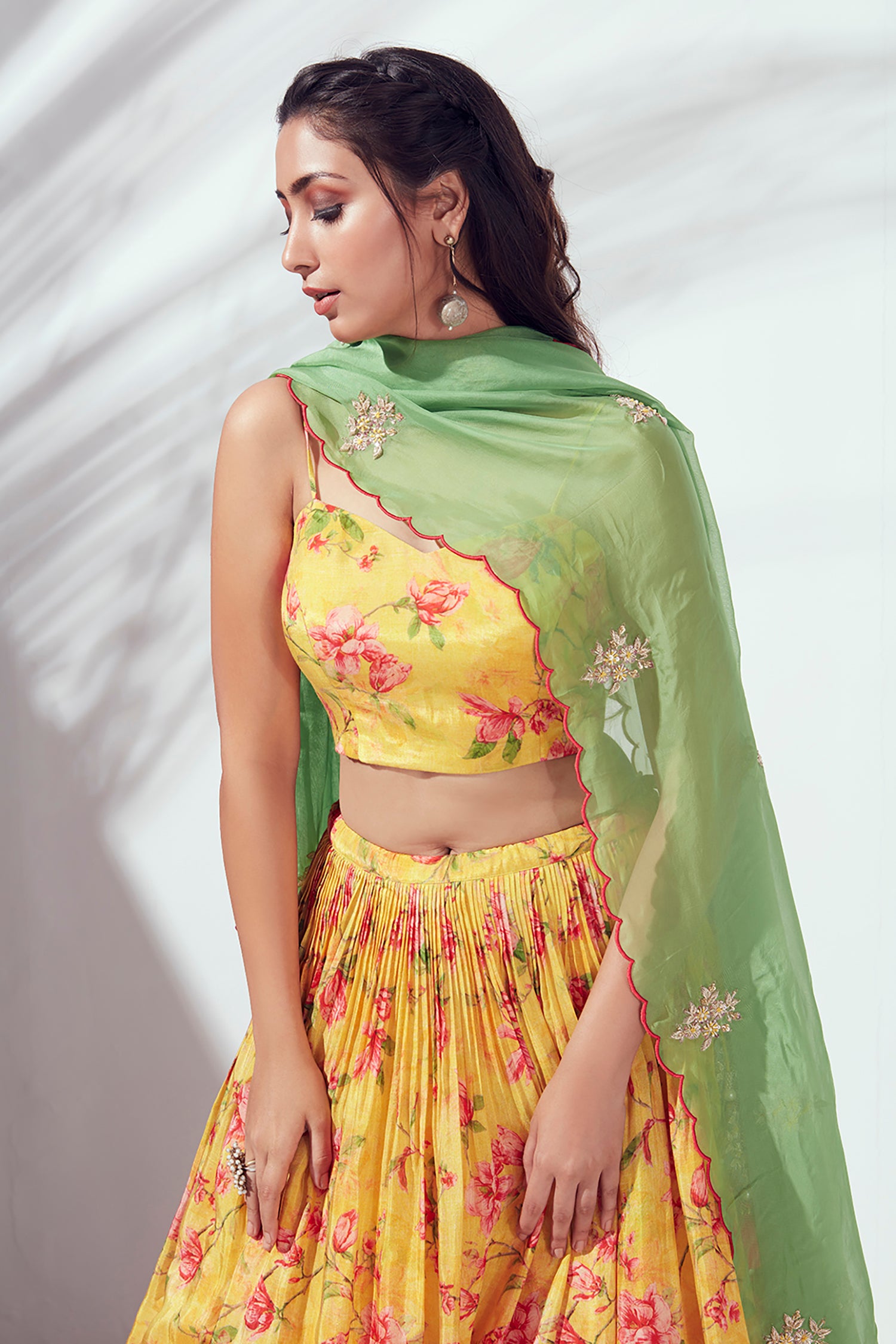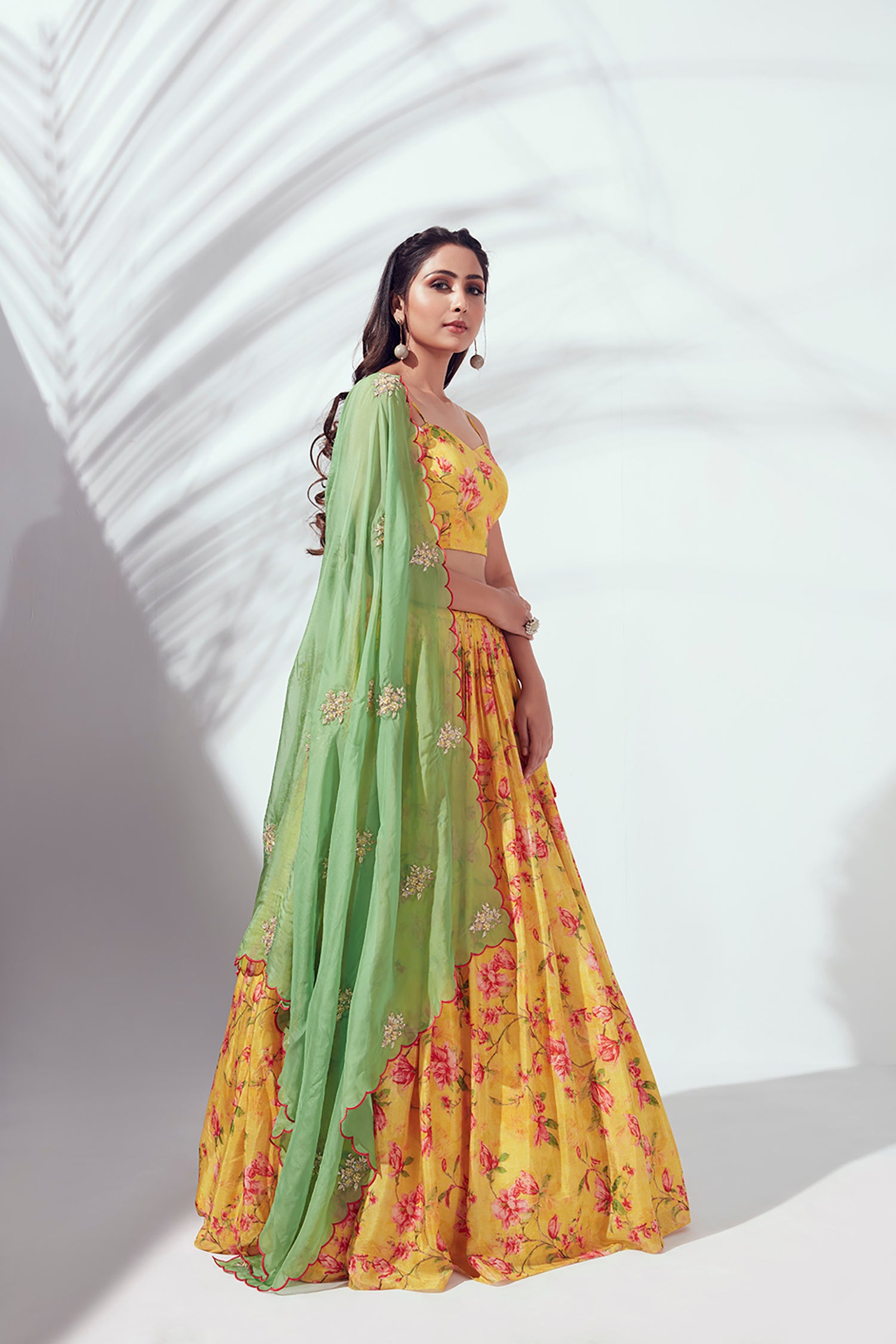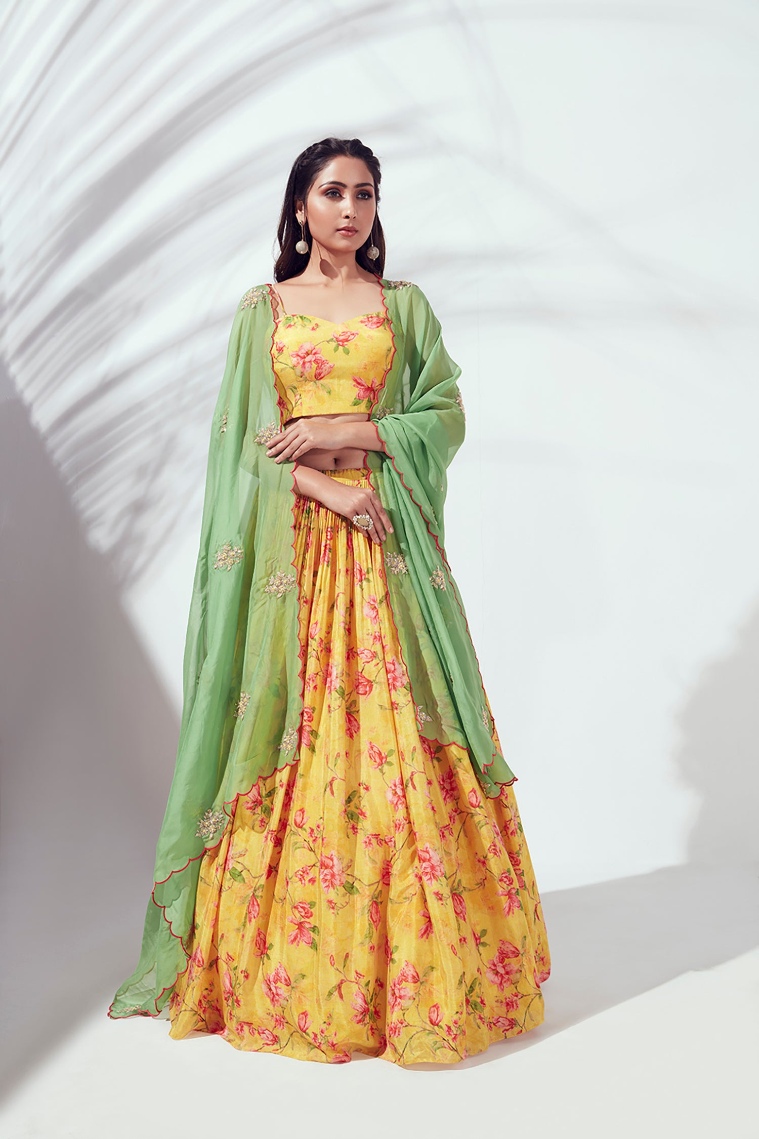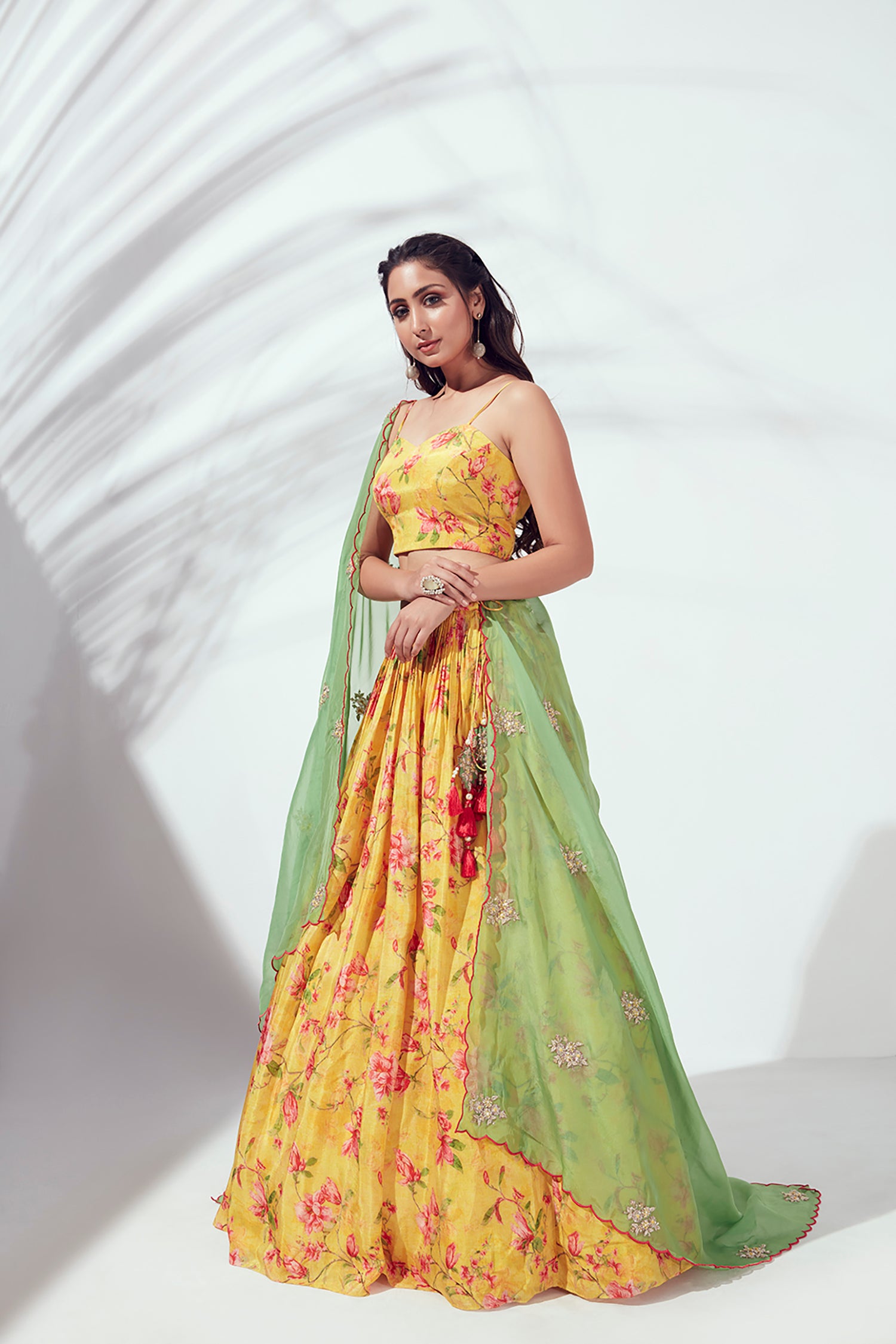 For the Mehendi ceremony, choose something easy to move in. Go for prints, green shades, or floral designs. The lehenga for mehendi fashefy collection has great options by Toskaa and Sapna Designer. A light designer lehenga in net or georgette will work best.