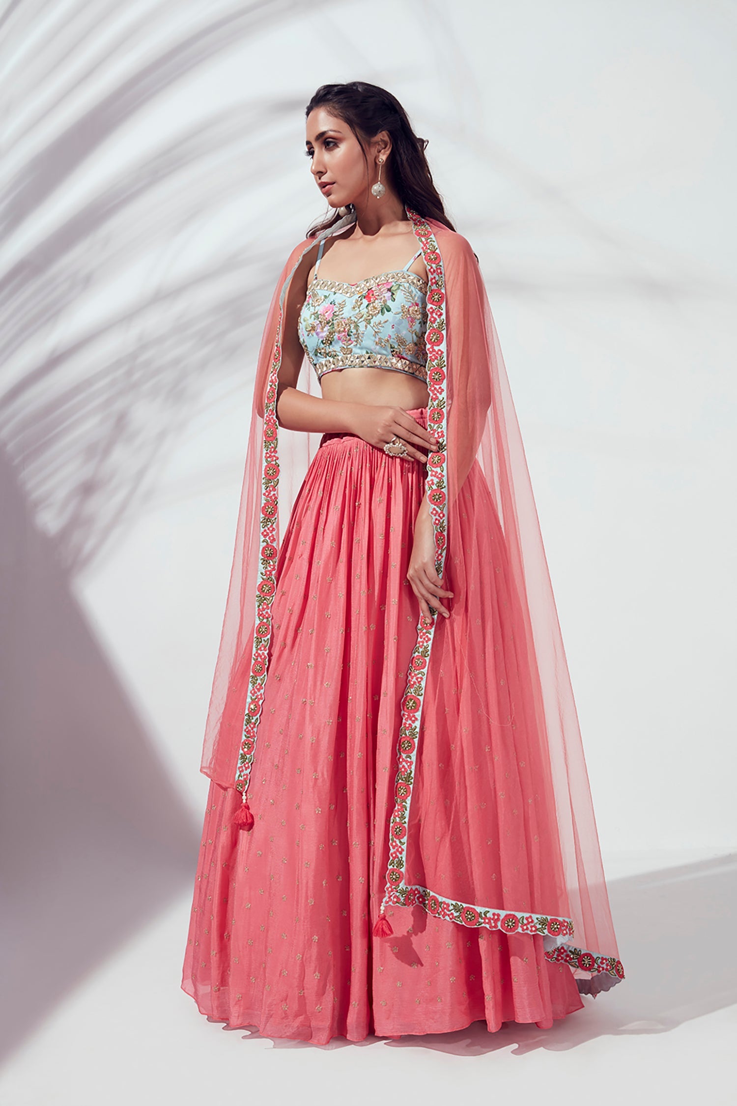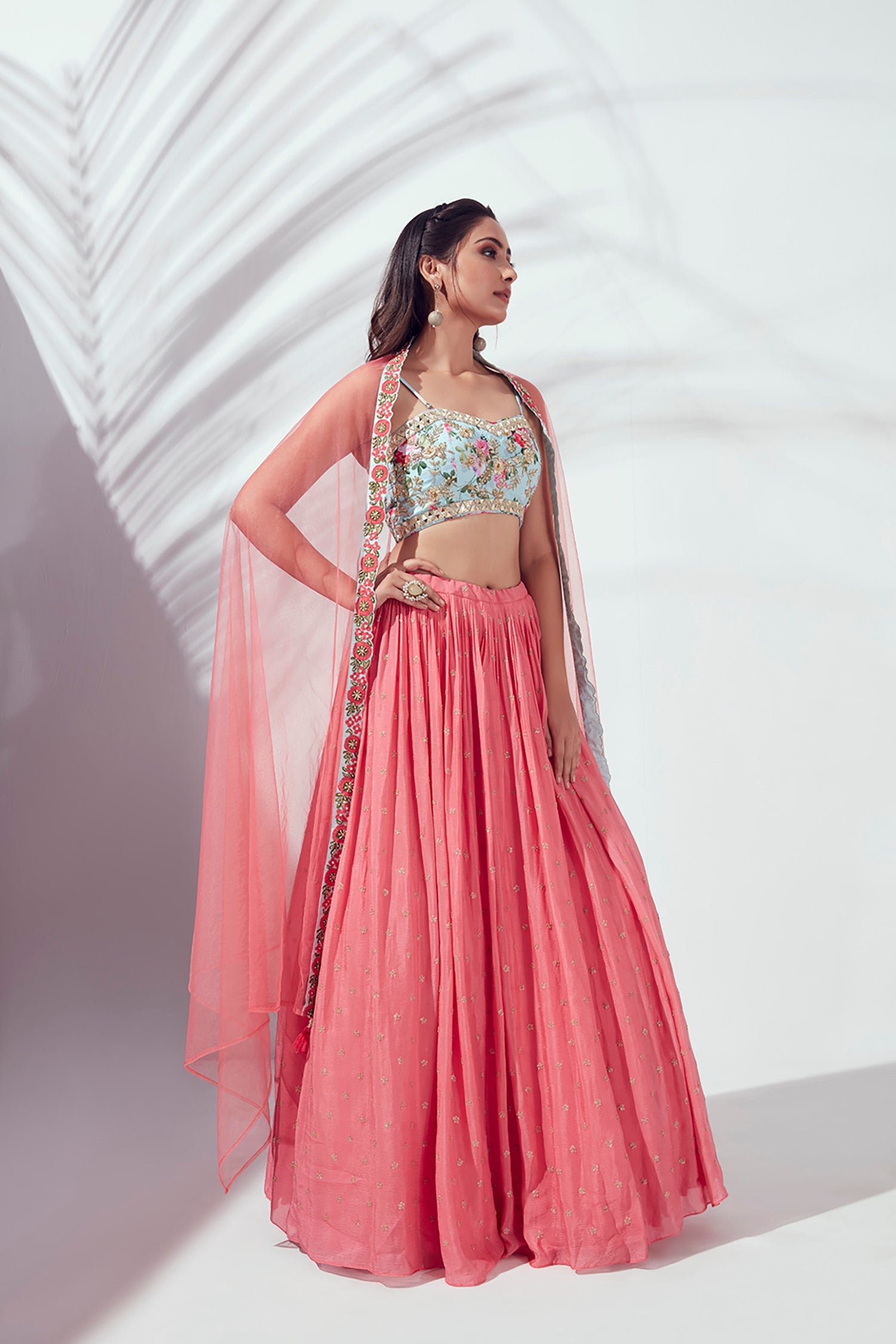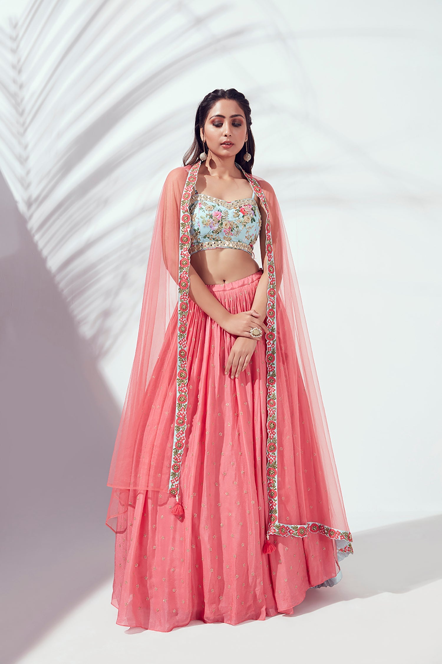 Mirror Work Blouse with Embroidered Lehenga and Shaded Net Dupatta