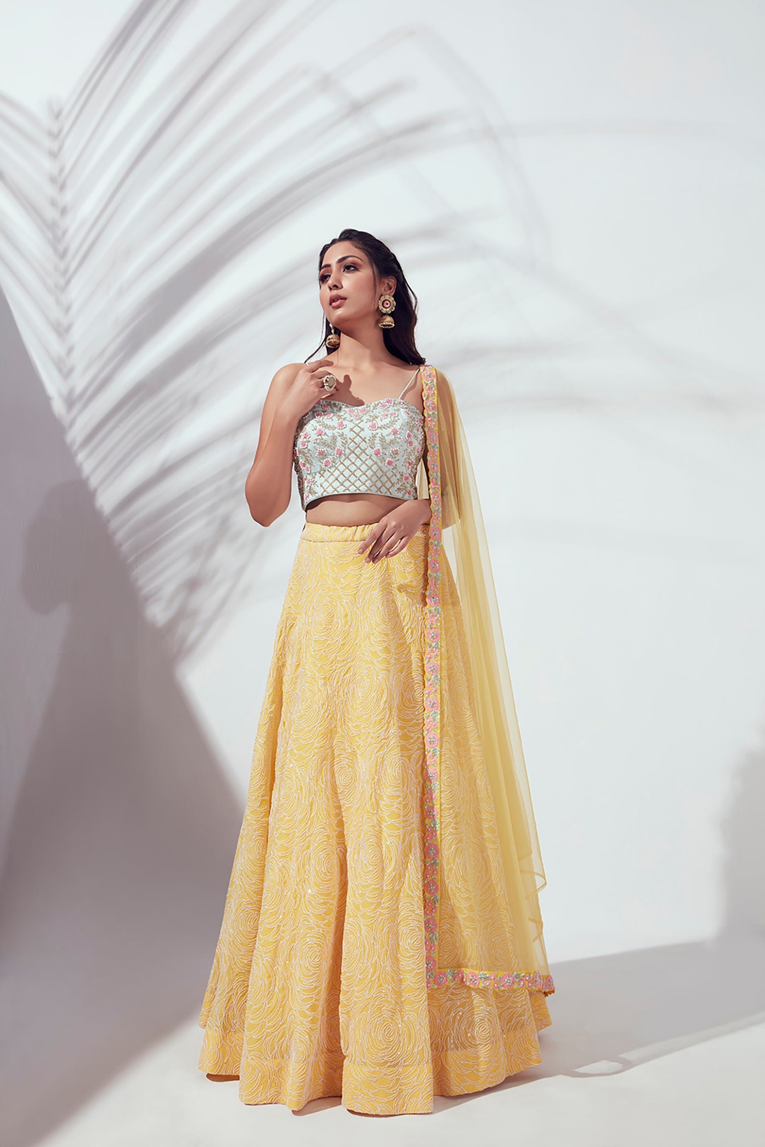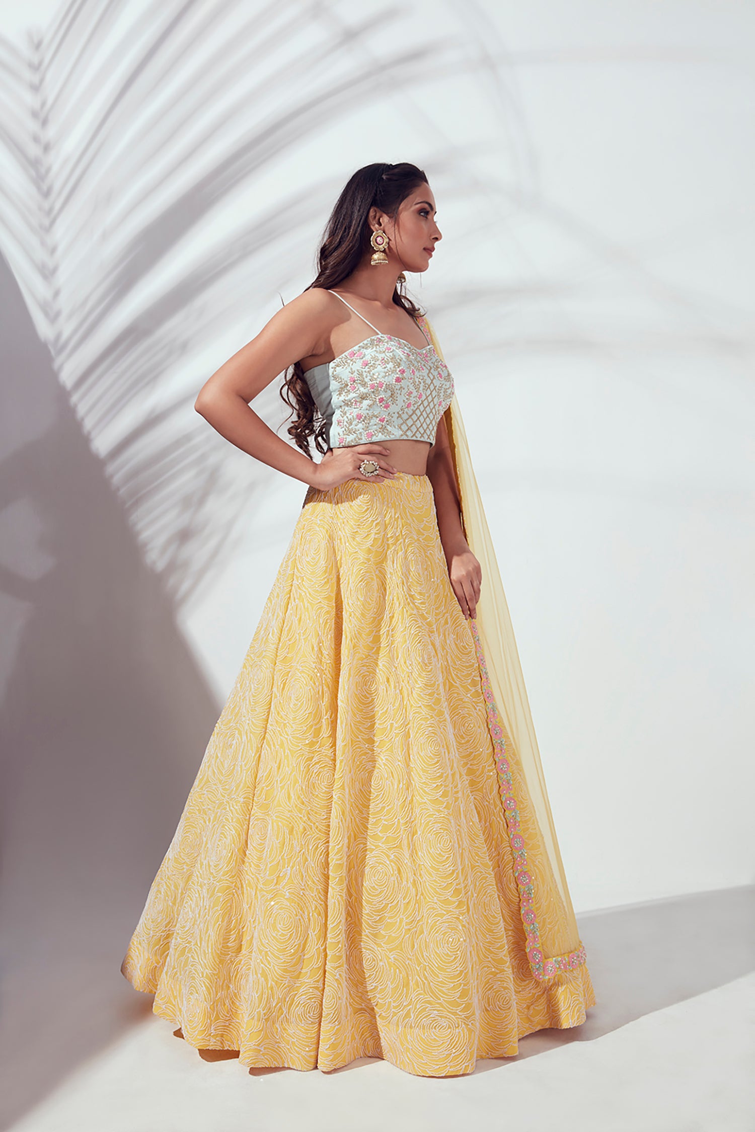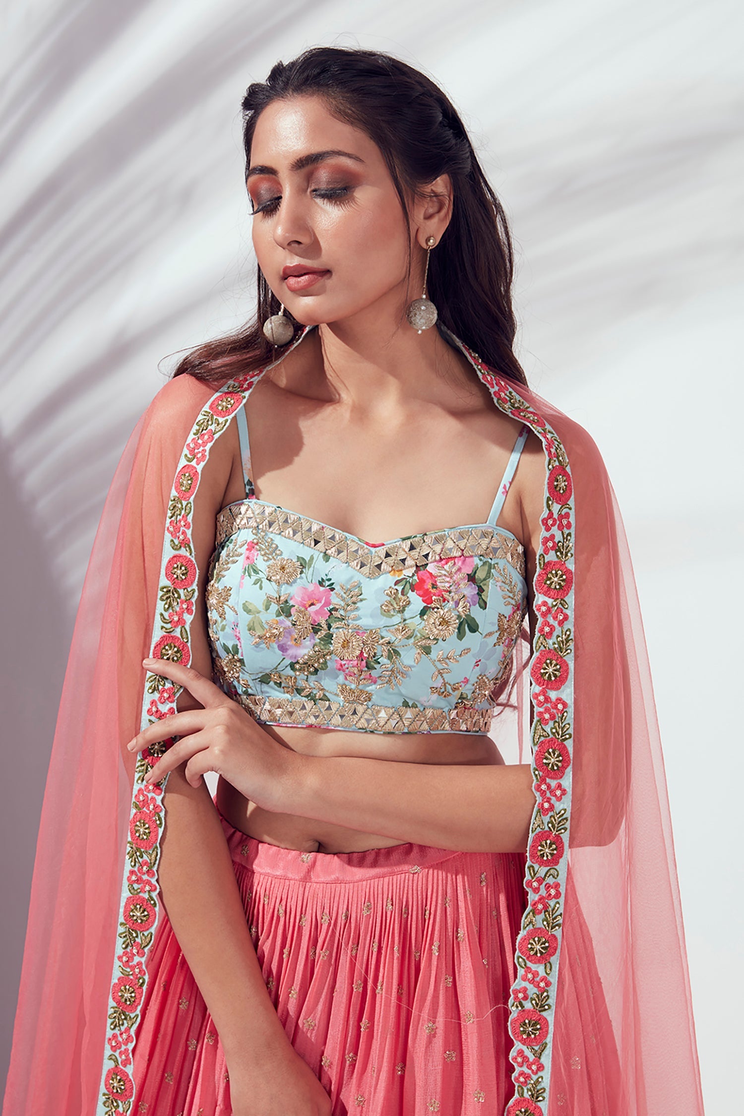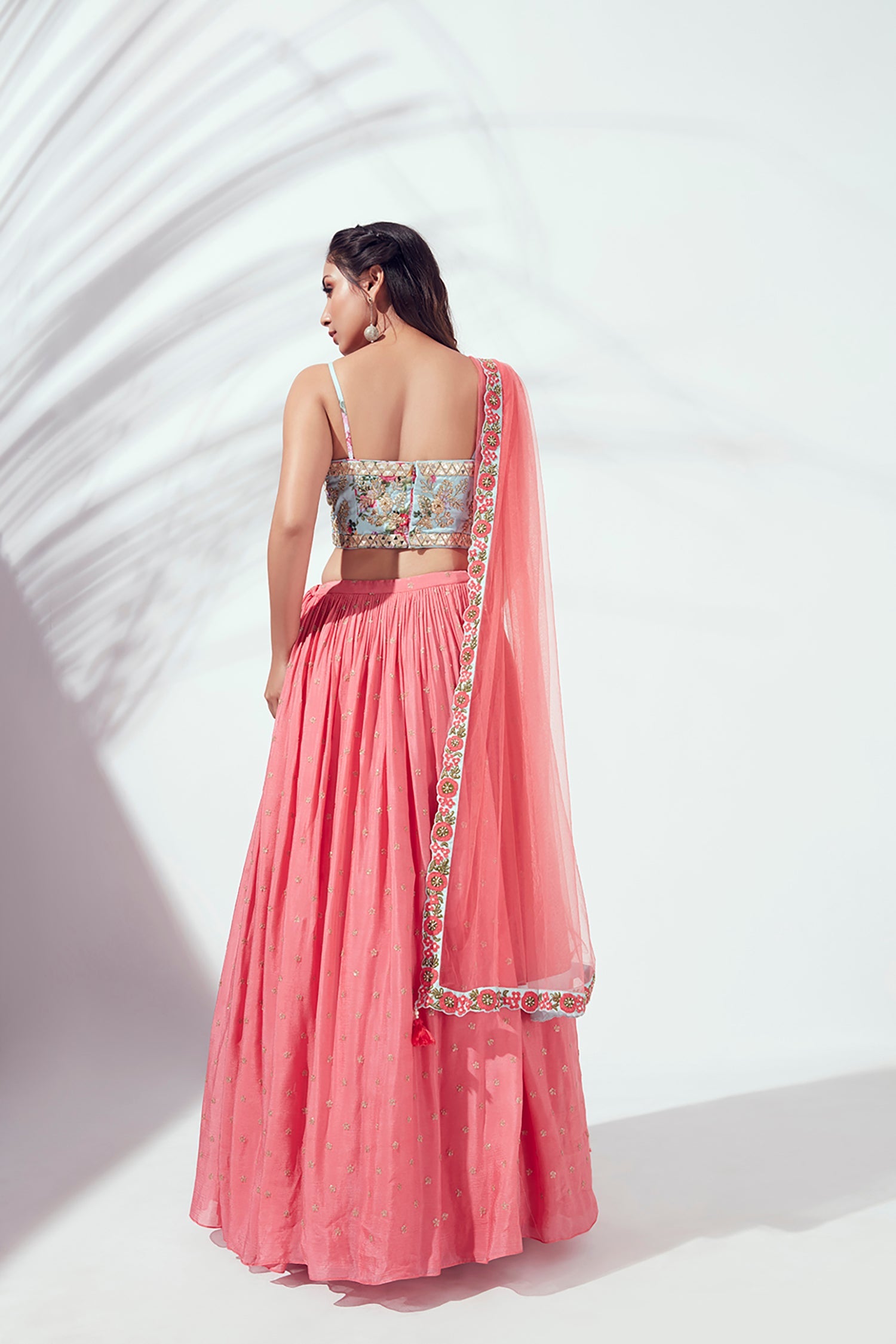Mirror Work Blouse with Embroidered Lehenga and Shaded Net Dupatta