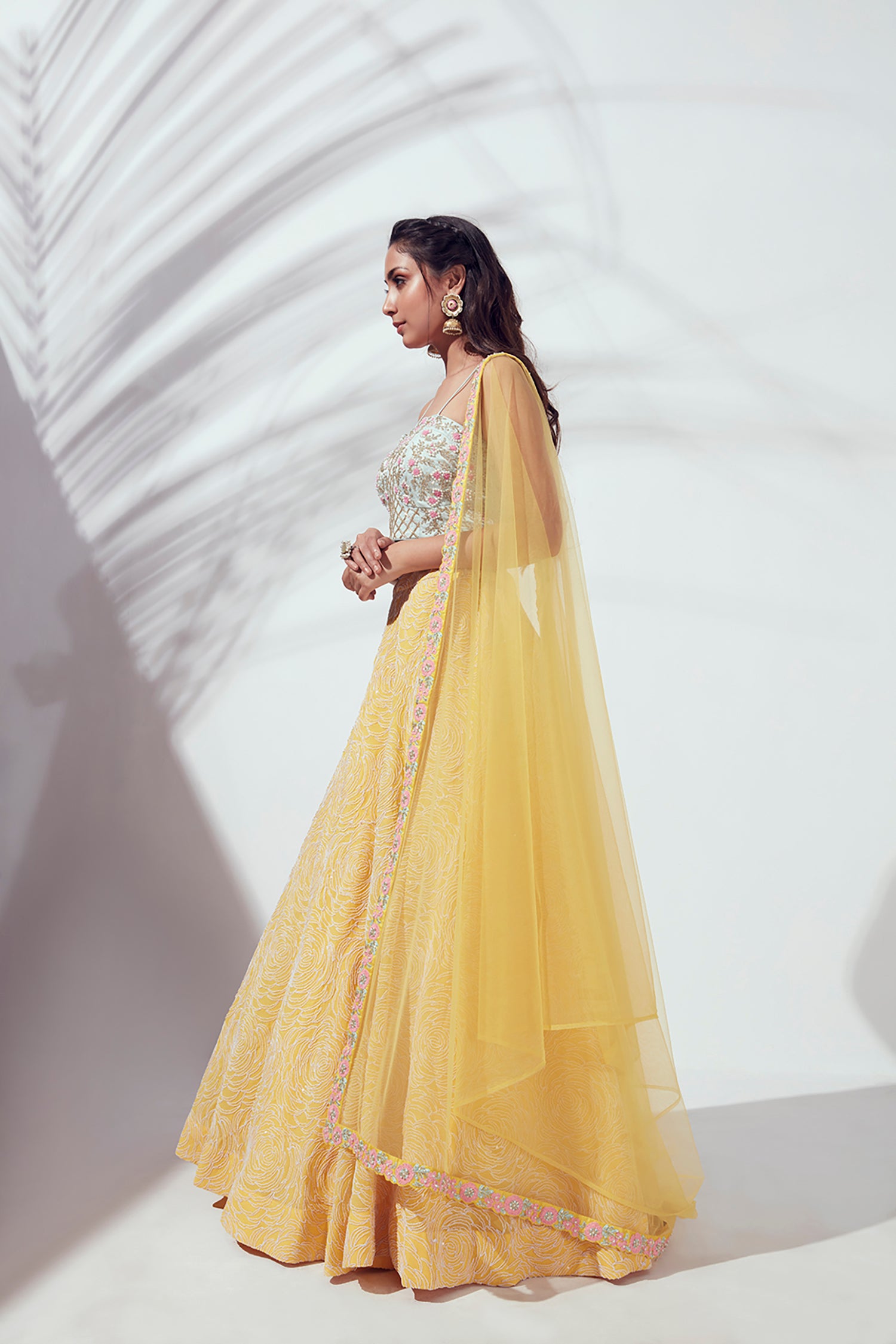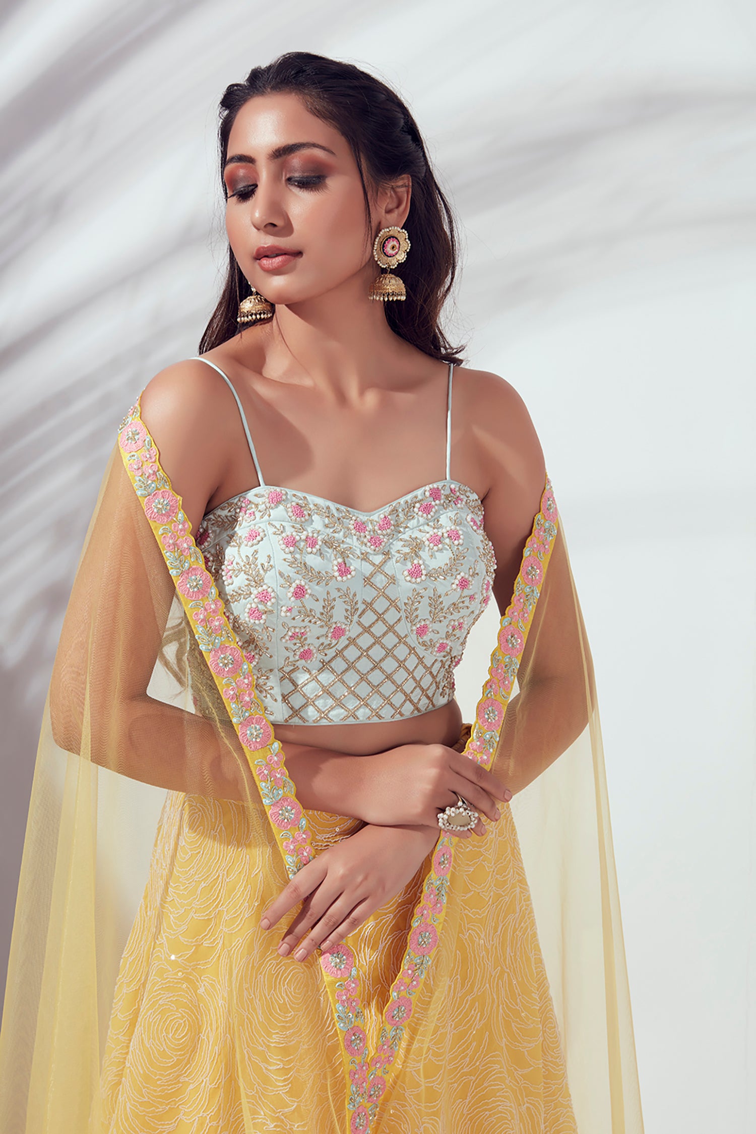 Hand Embroidered Bustier Blouse with Embellished Net Lehenga and Dupatta