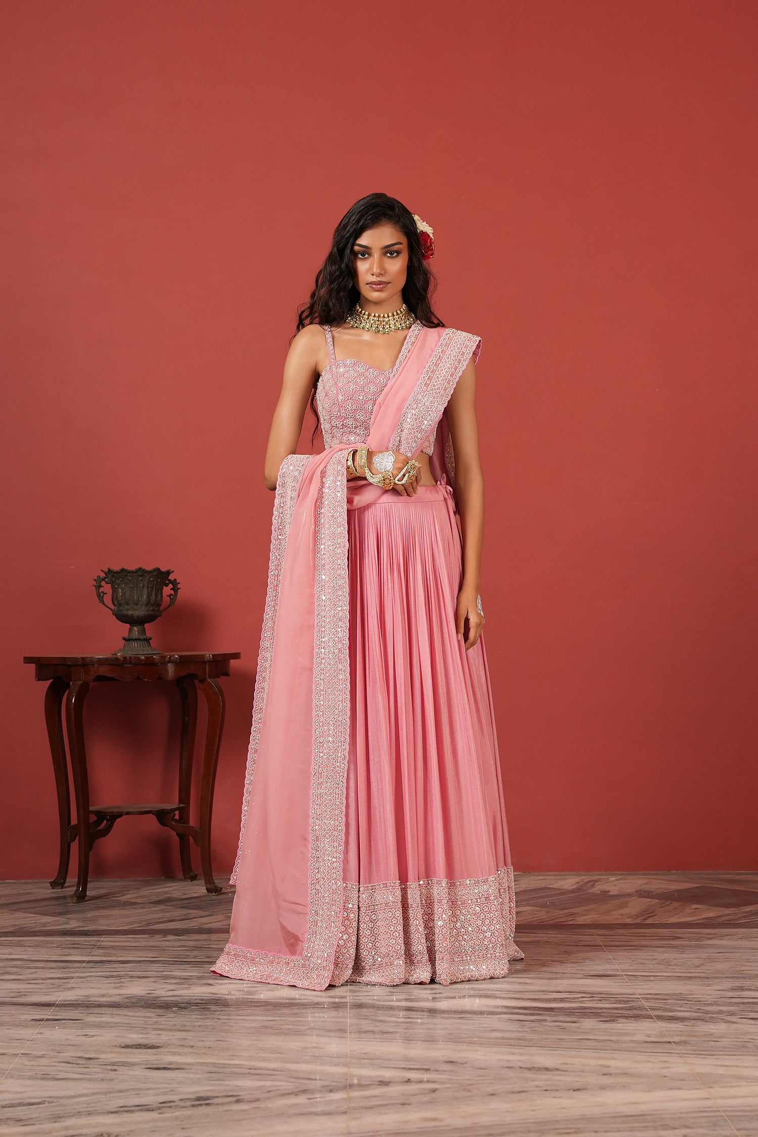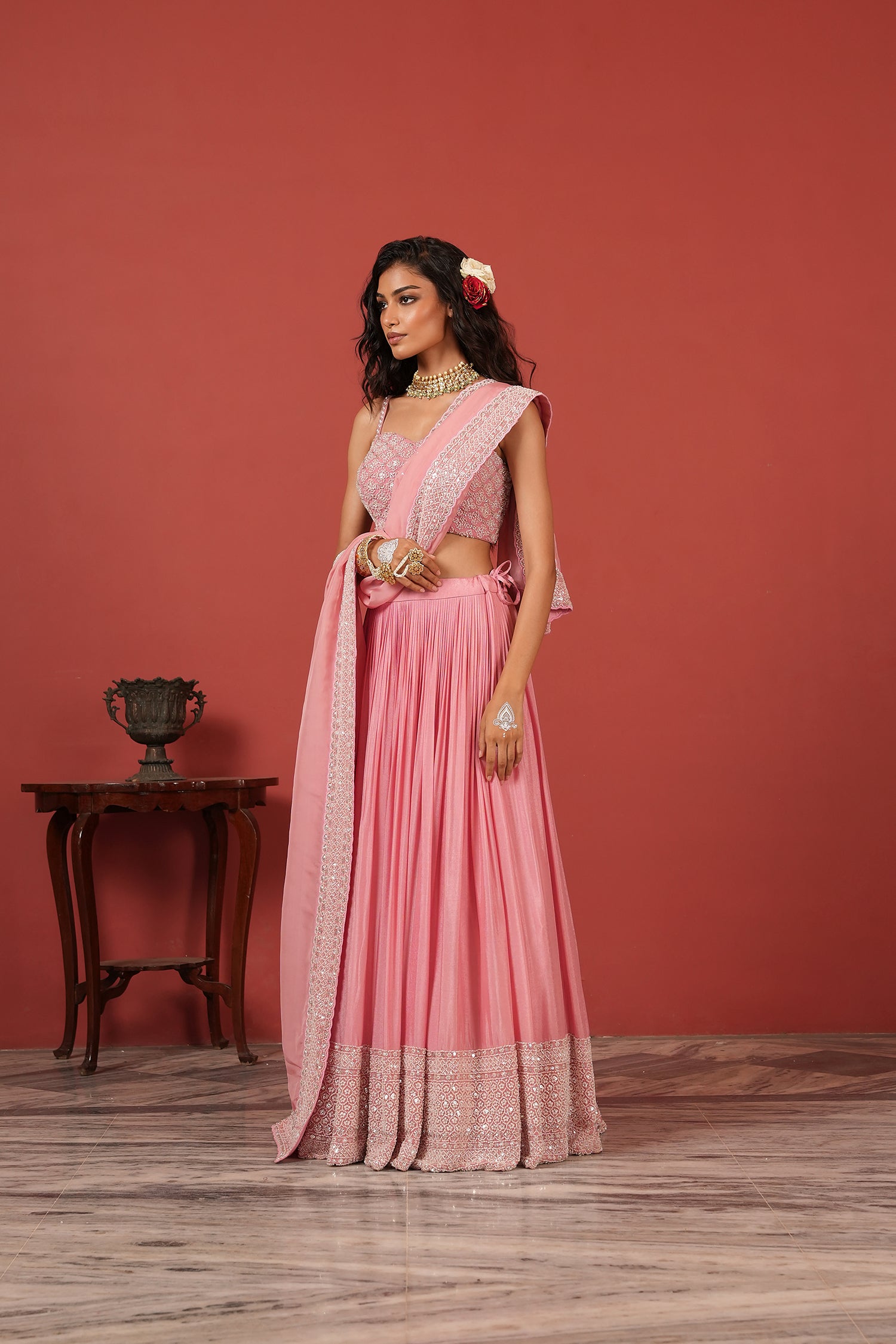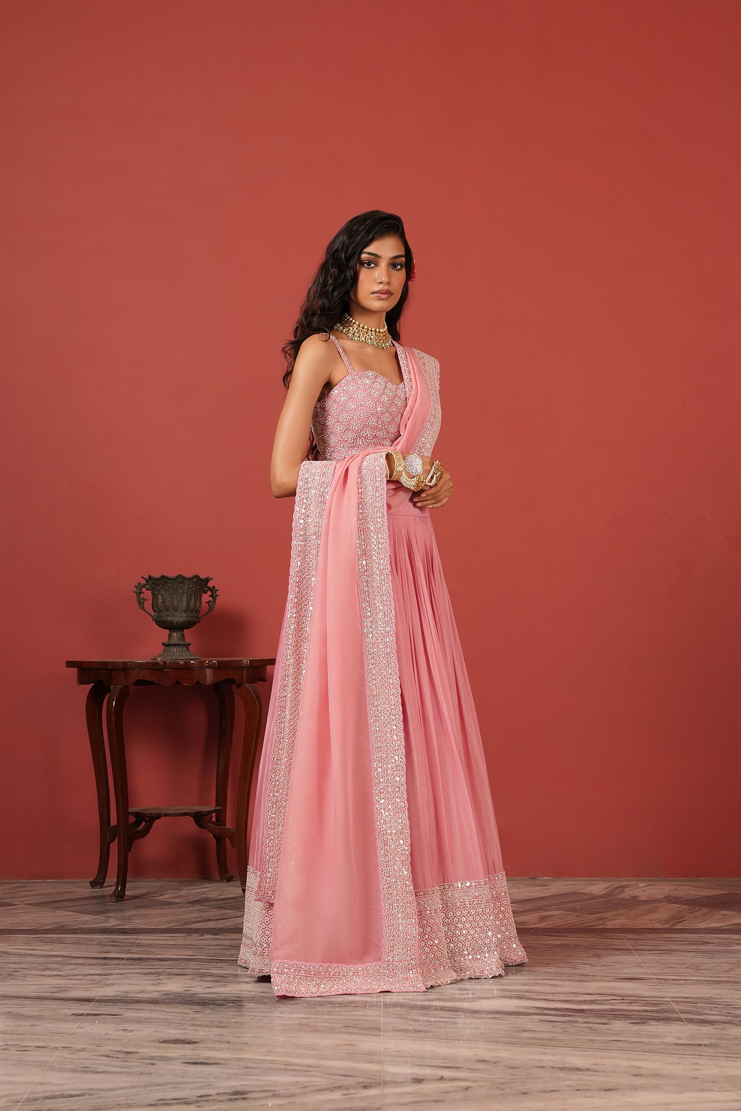 For the reception, choose a fashefy lehenga that is simple but elegant. The lehenga for reception section has many styles in silk and organza. Go for a soft color like peach, silver, or rose gold in an Indo-Western lehenga style that stands out.