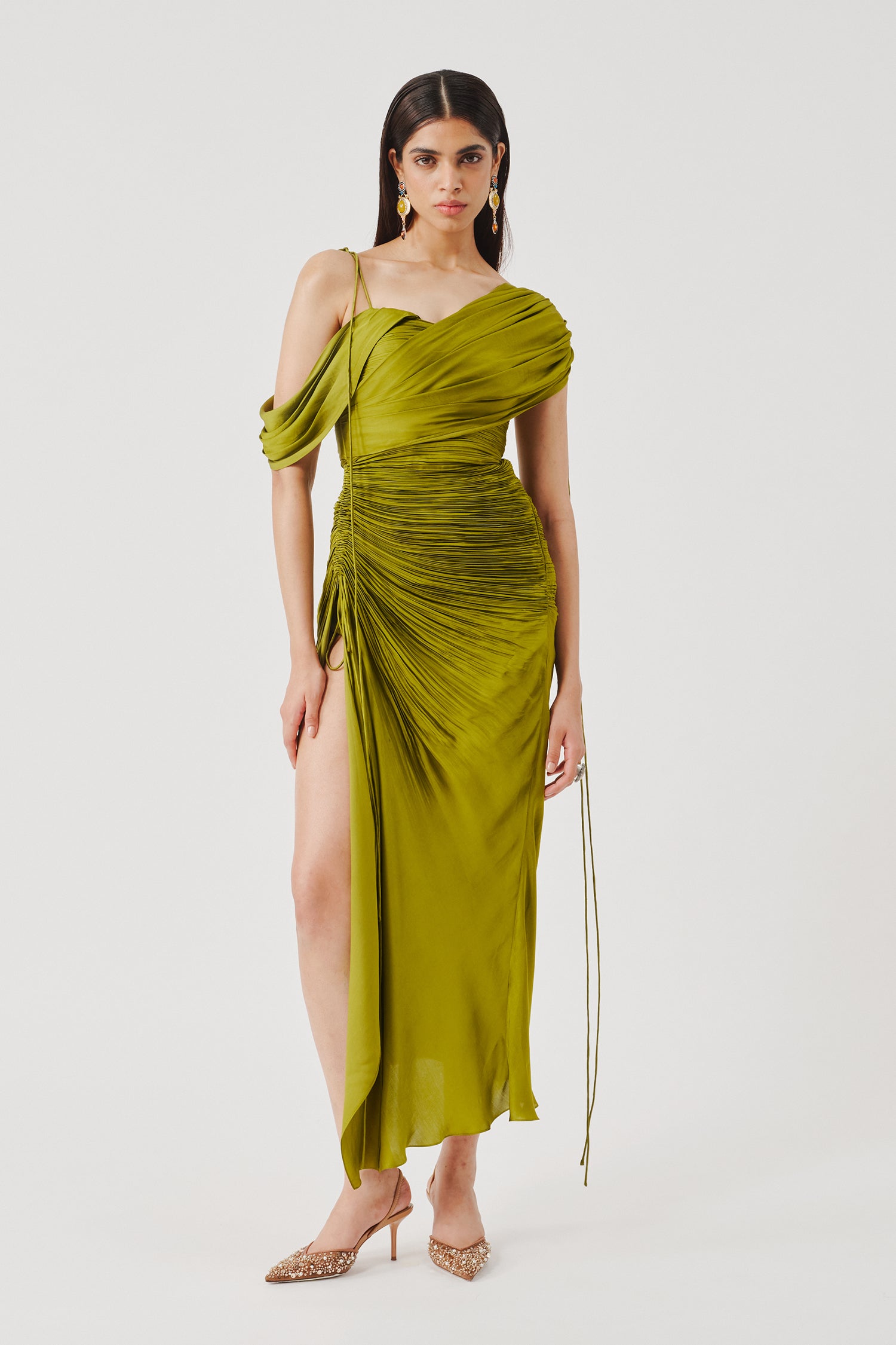 Dark Olive Gajji Silk Embellished Ruffled Saree