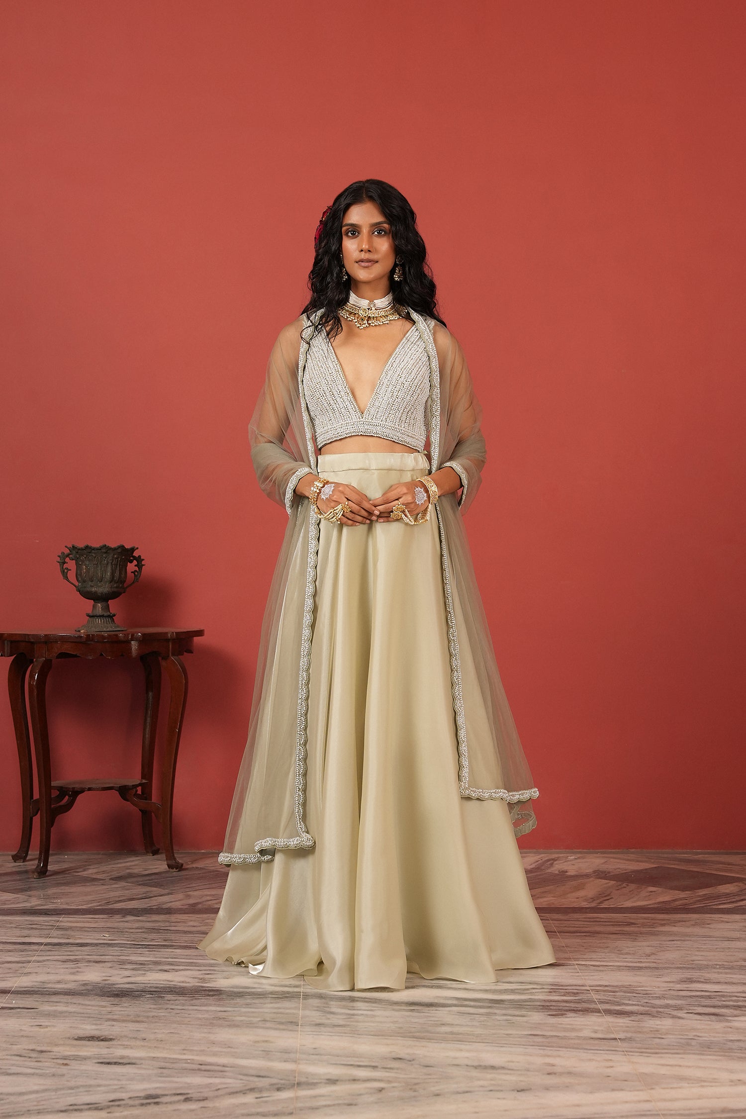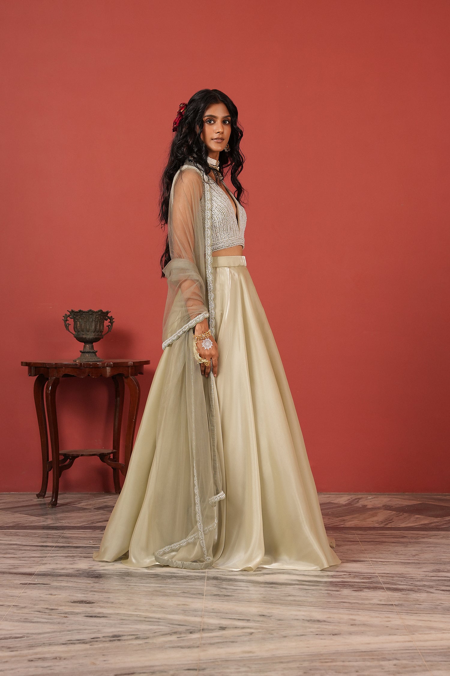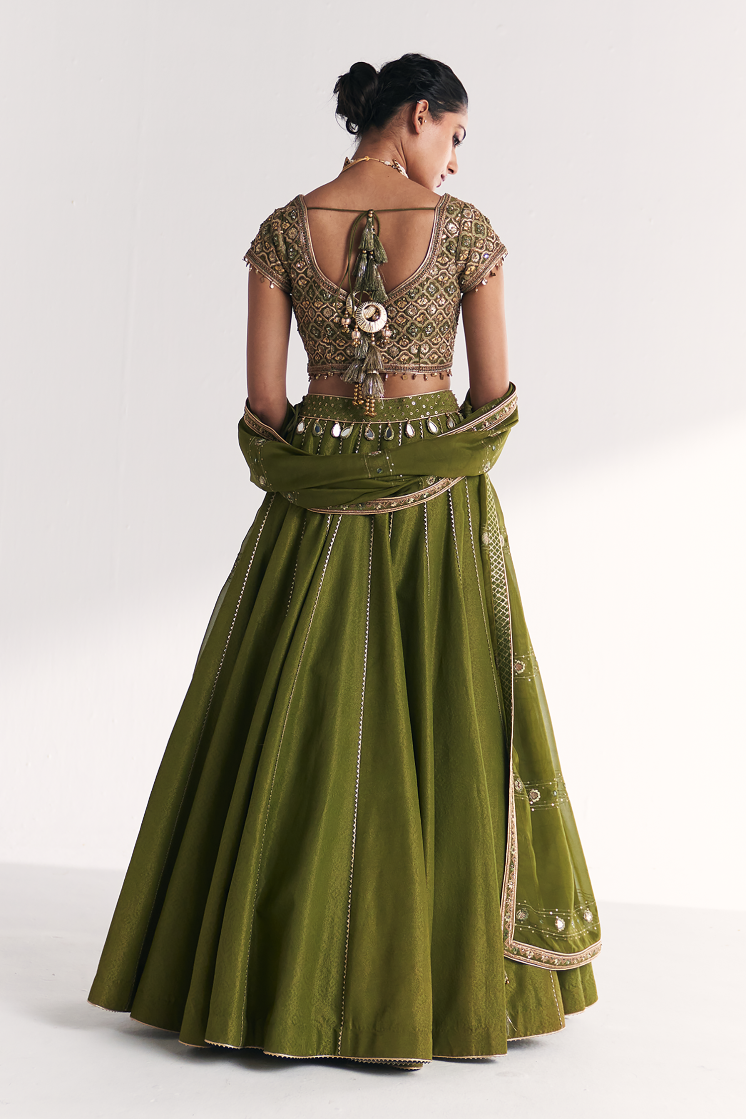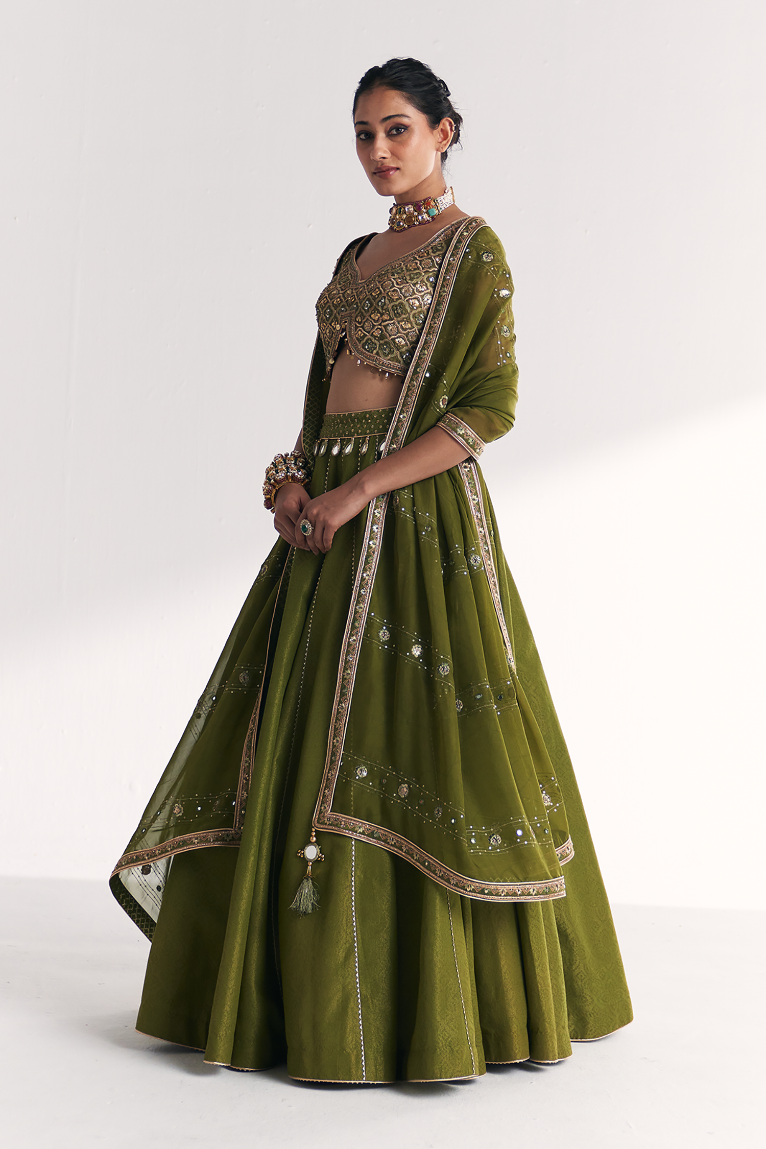 Olive Recycled Polyester Metallic Embroidered Lehenga Set