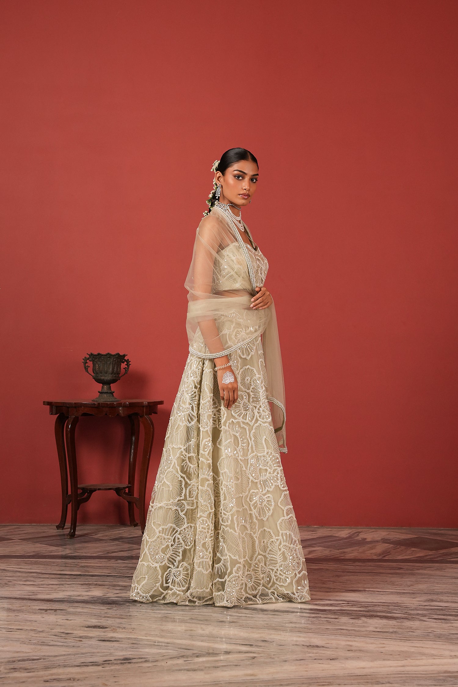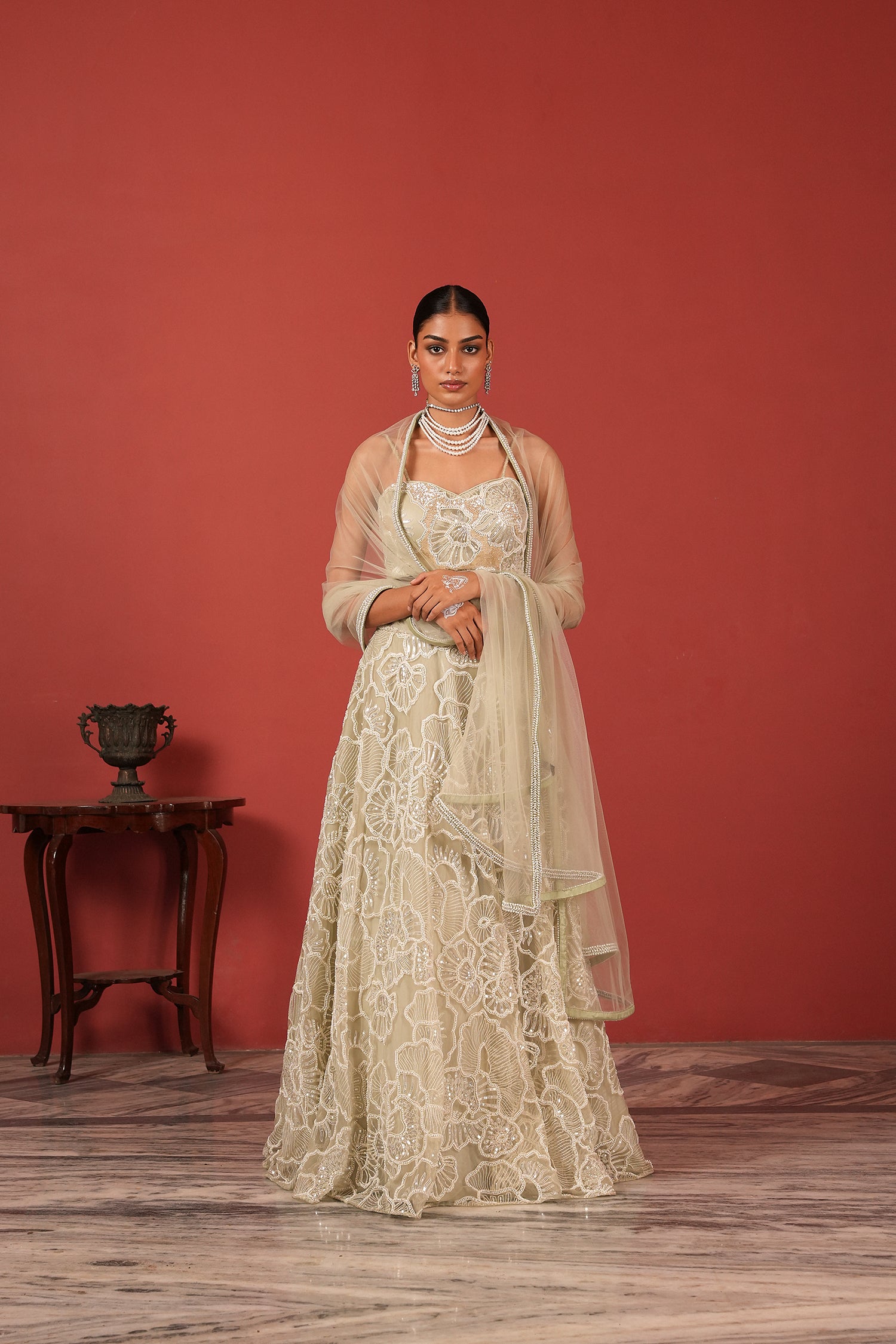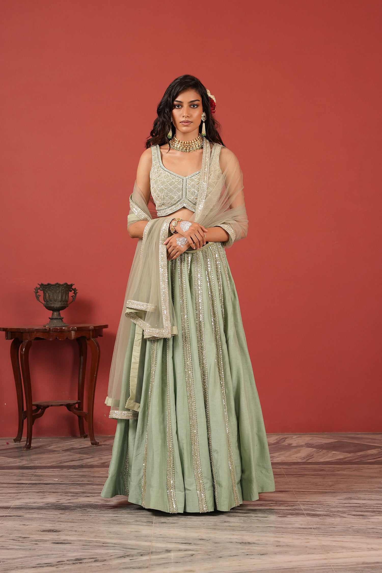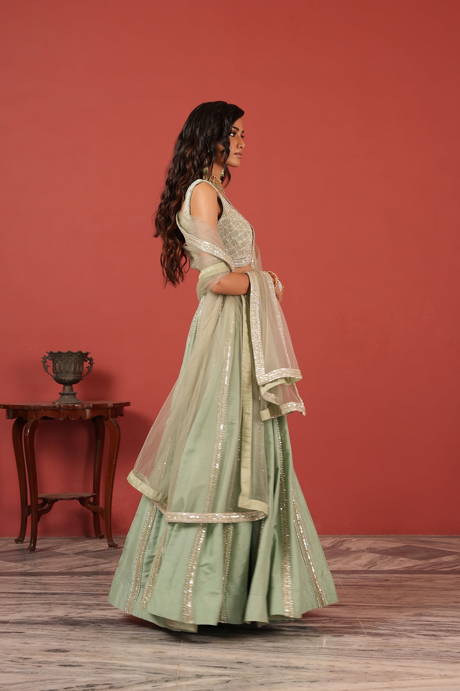 Olive Recycled Polyester Metallic Embroidered Lehenga Set