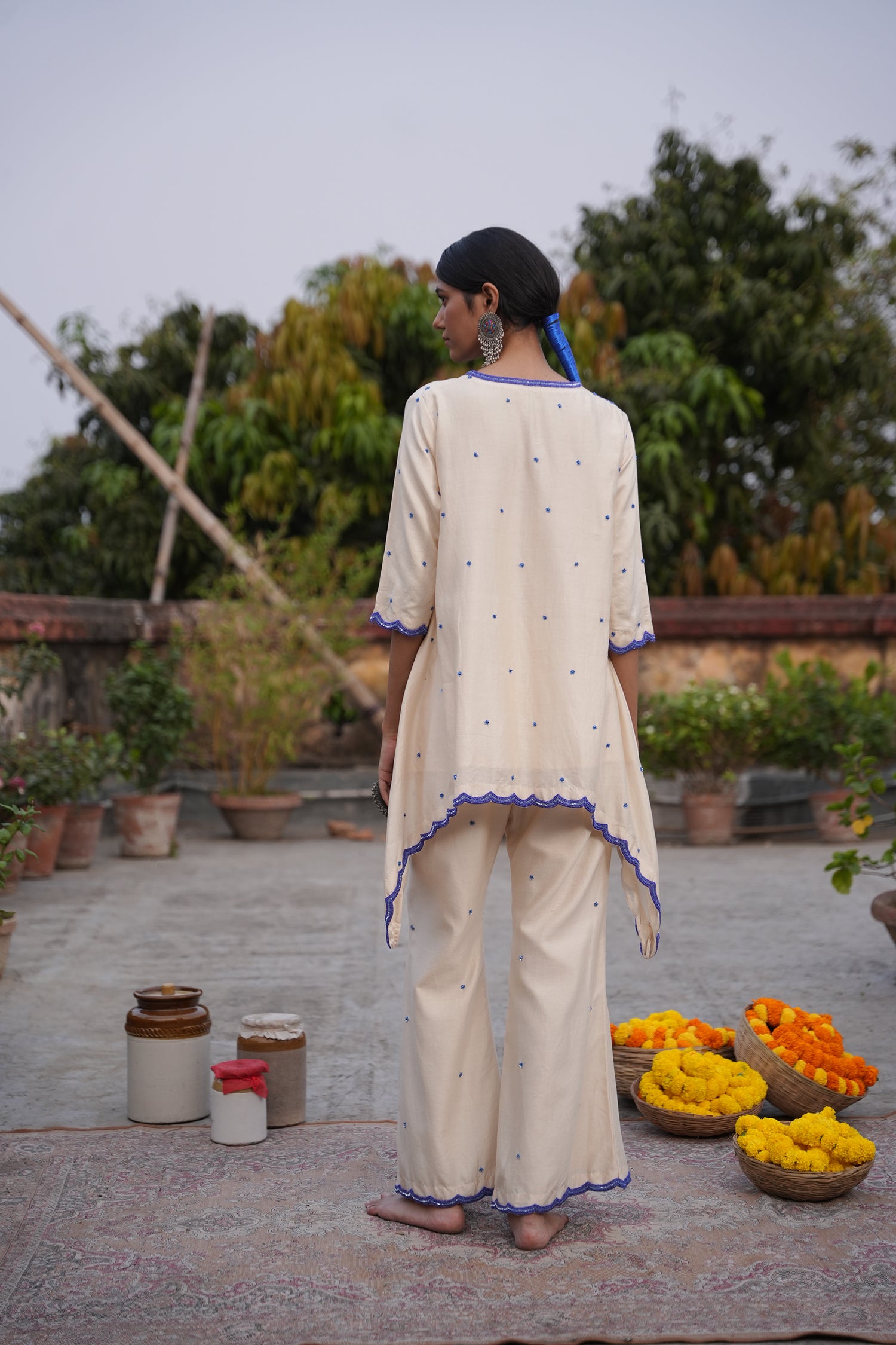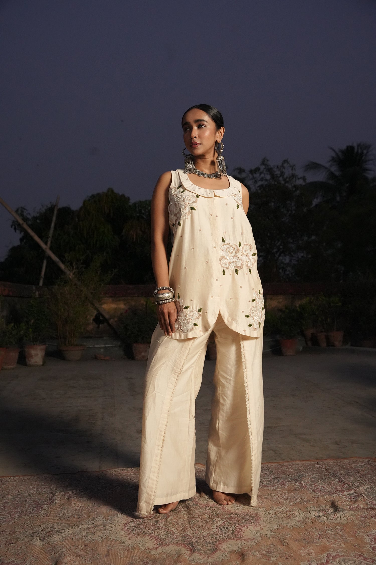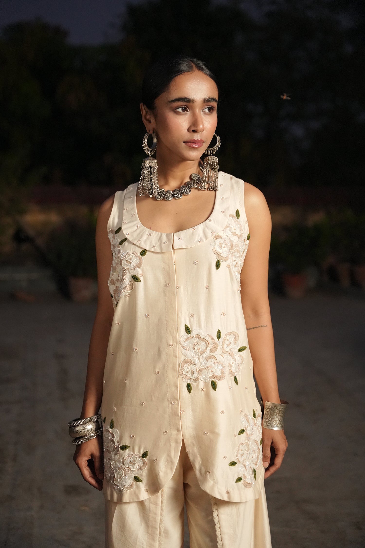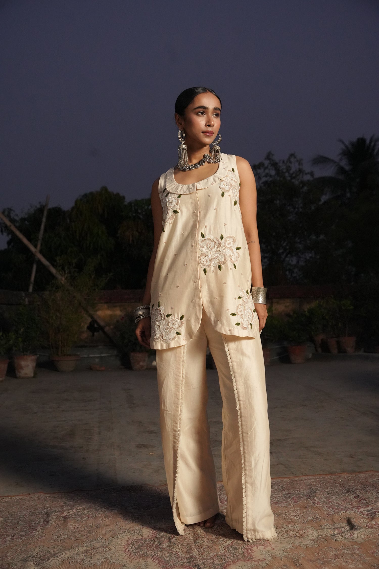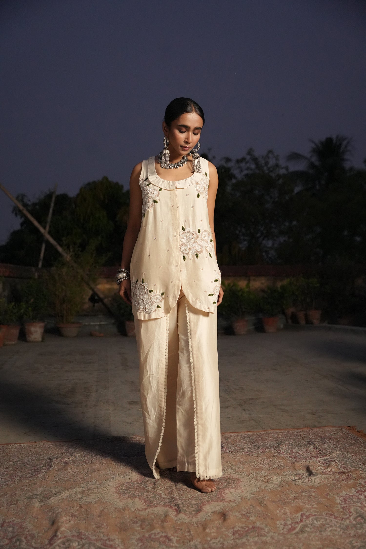 Neema Off White Chanderi Collar Kurta With Flap Border Pant