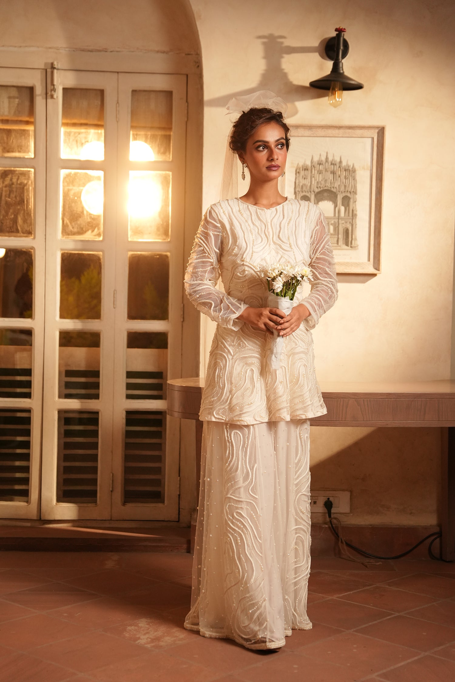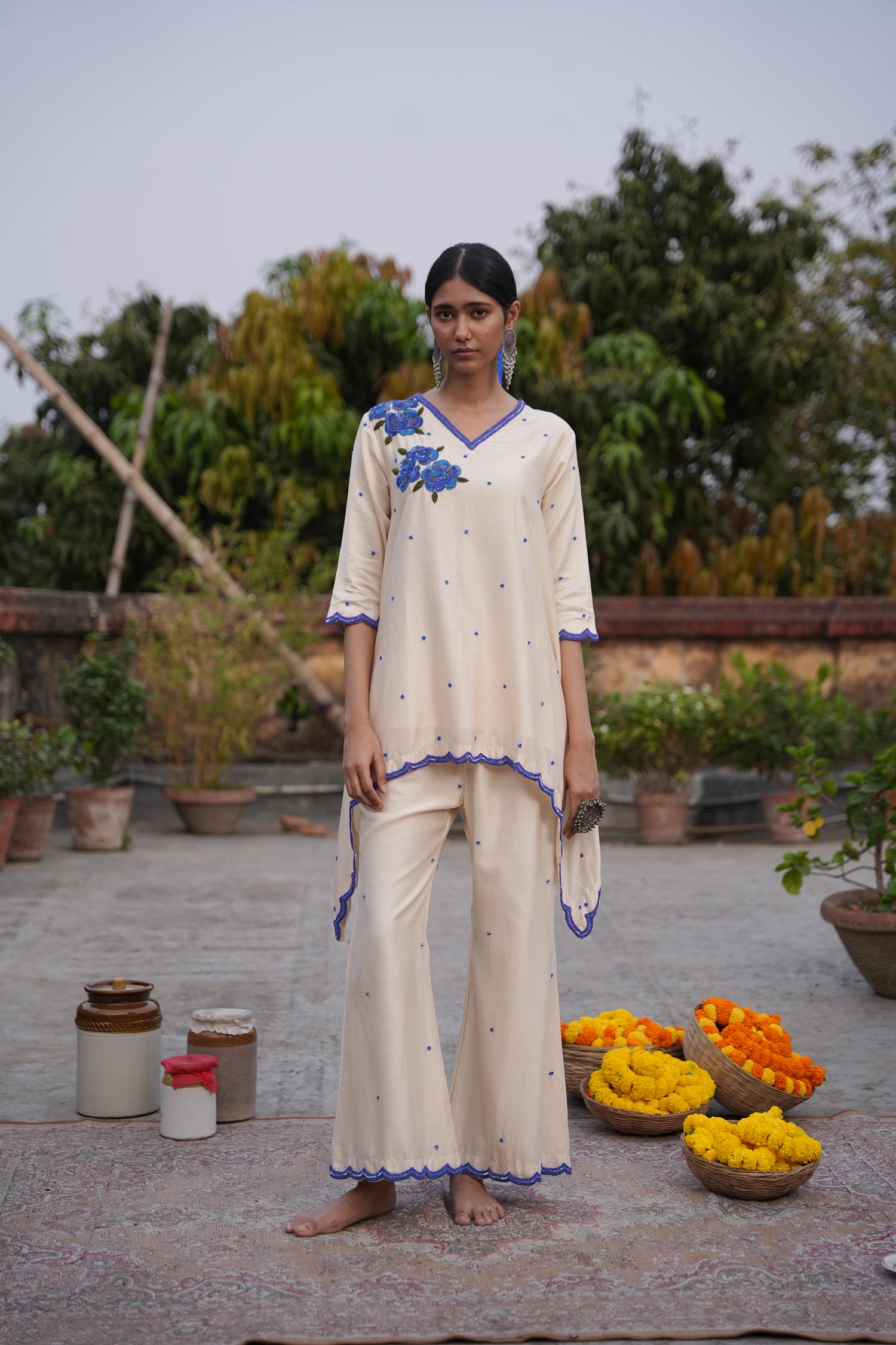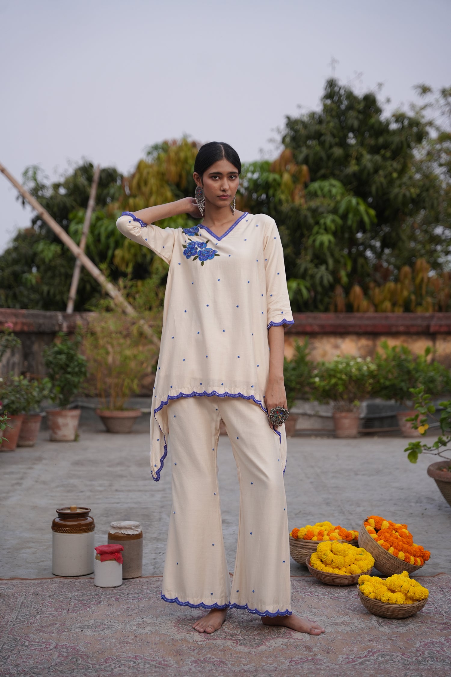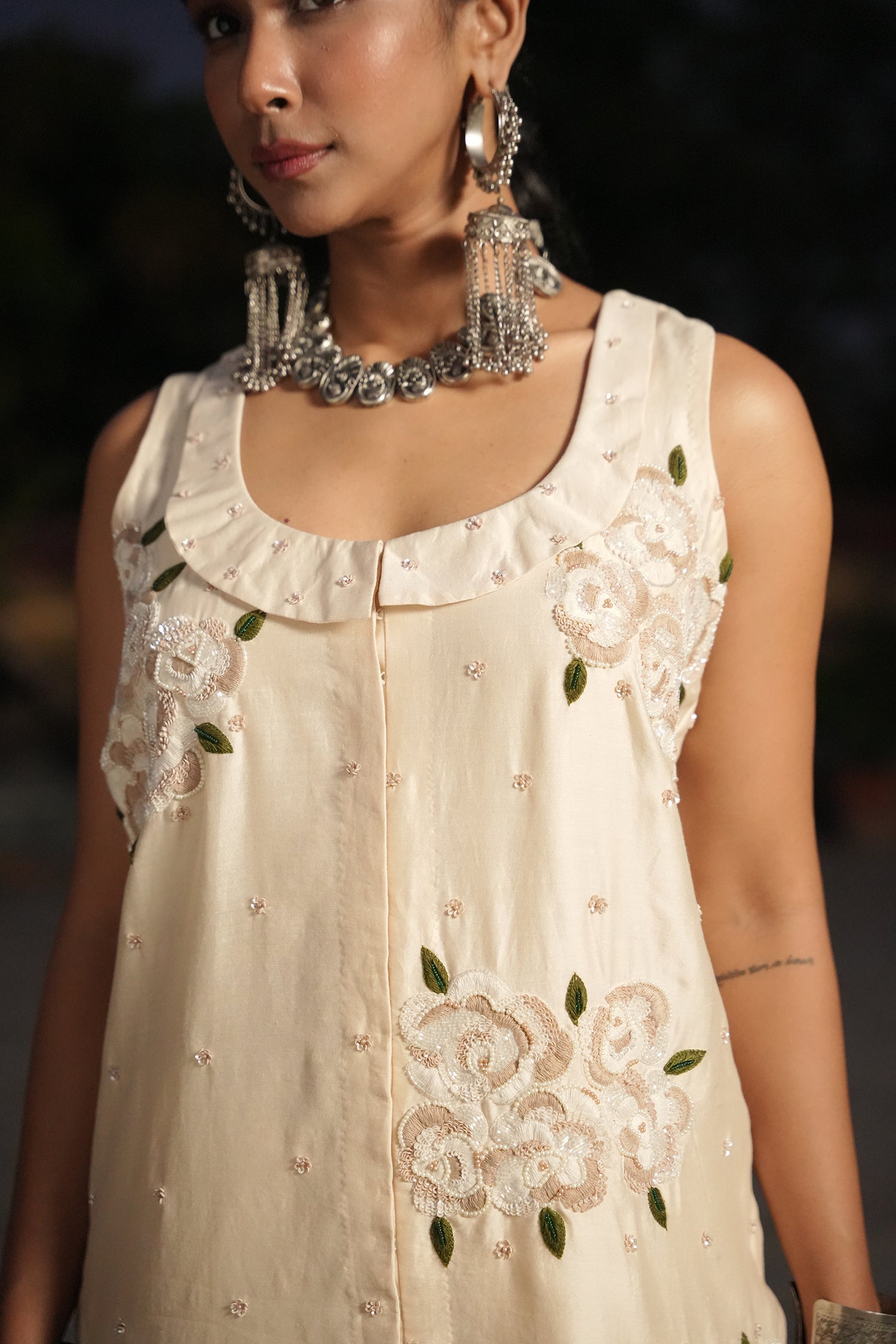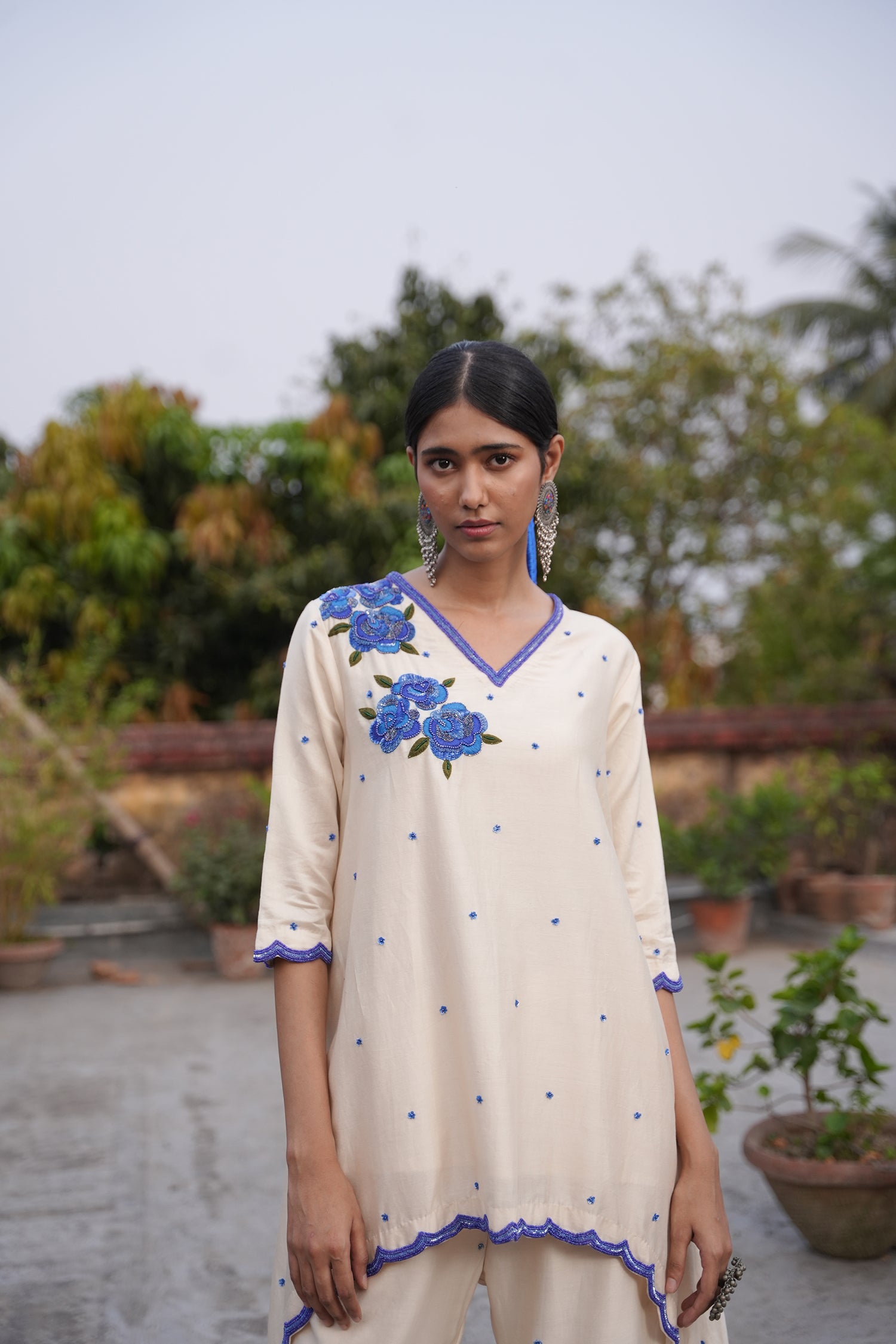 Neema Off White Chanderi Collar Kurta With Flap Border Pant