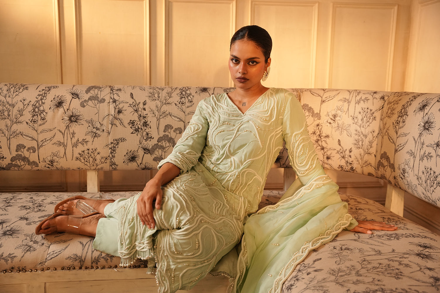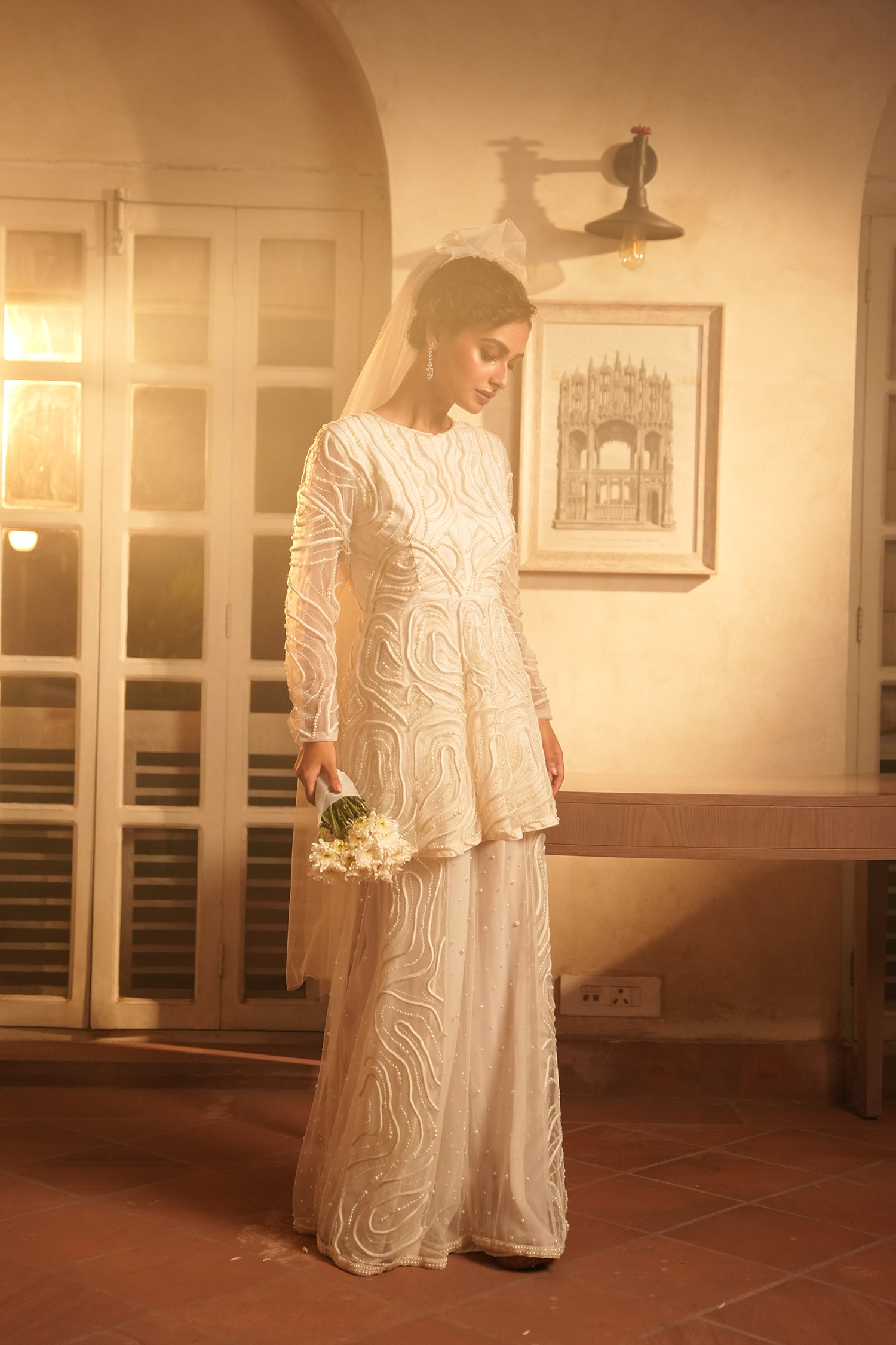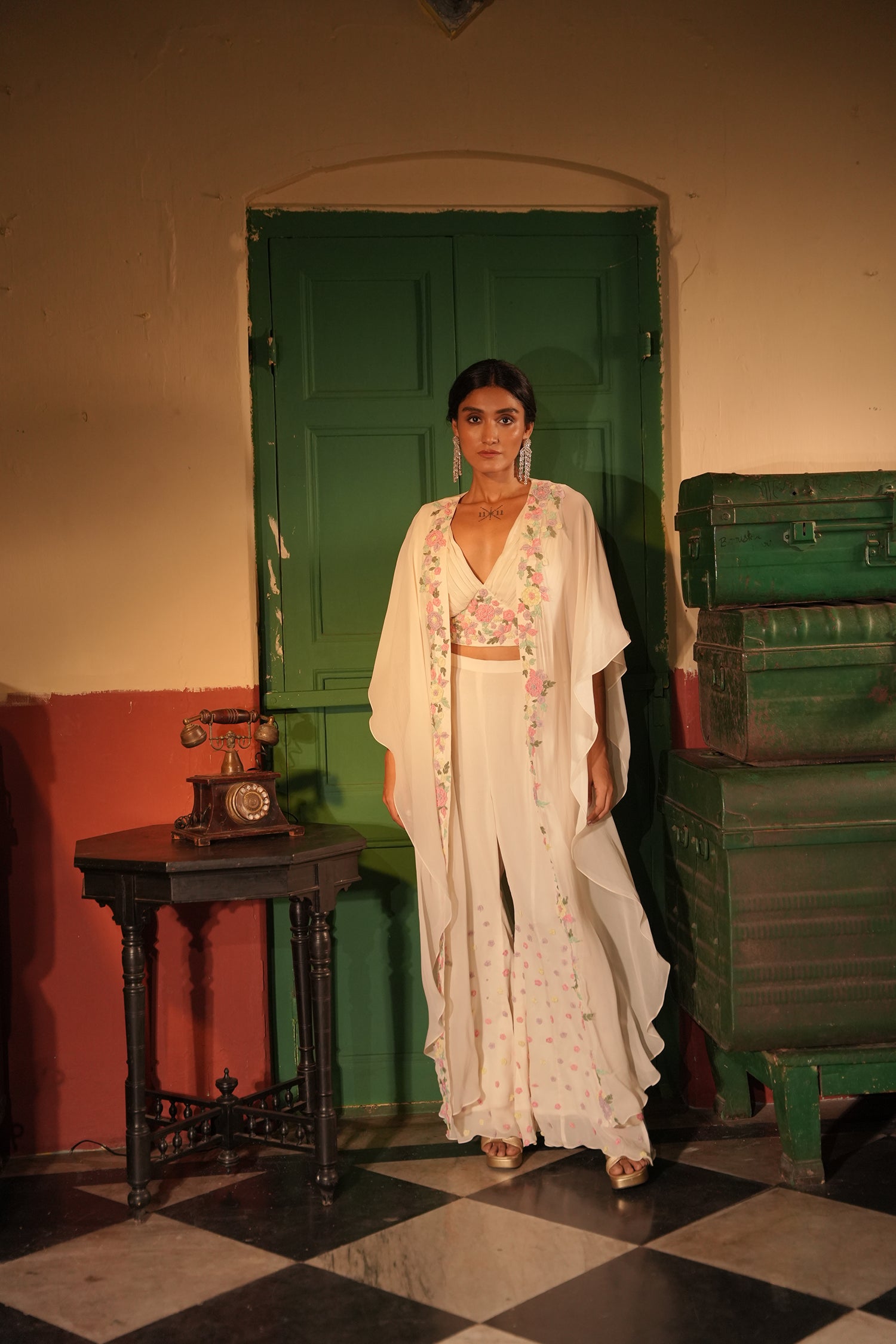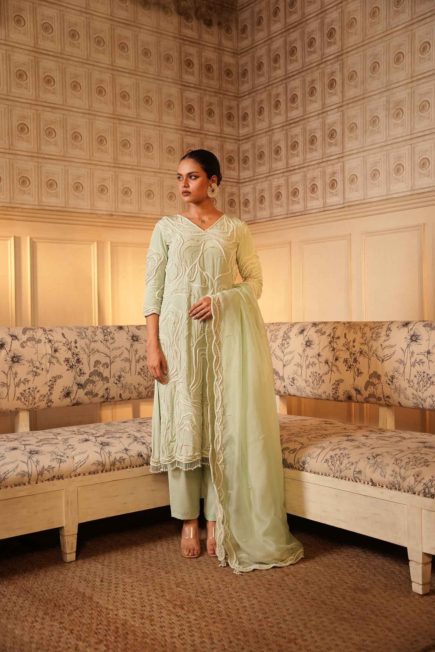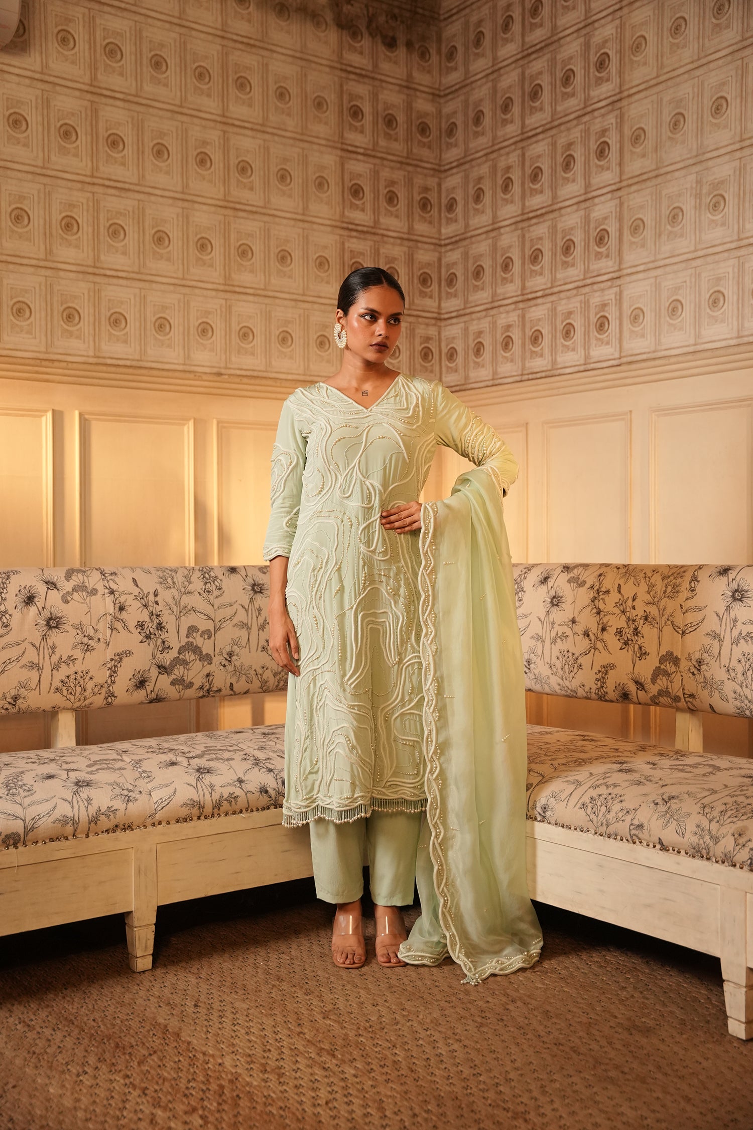Neema Off White Chanderi Collar Kurta With Flap Border Pant