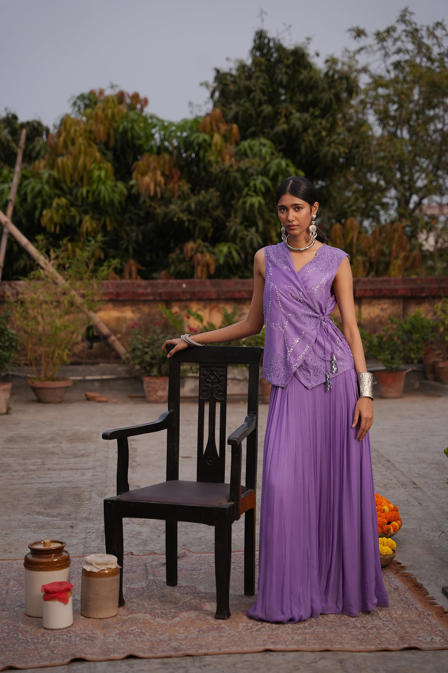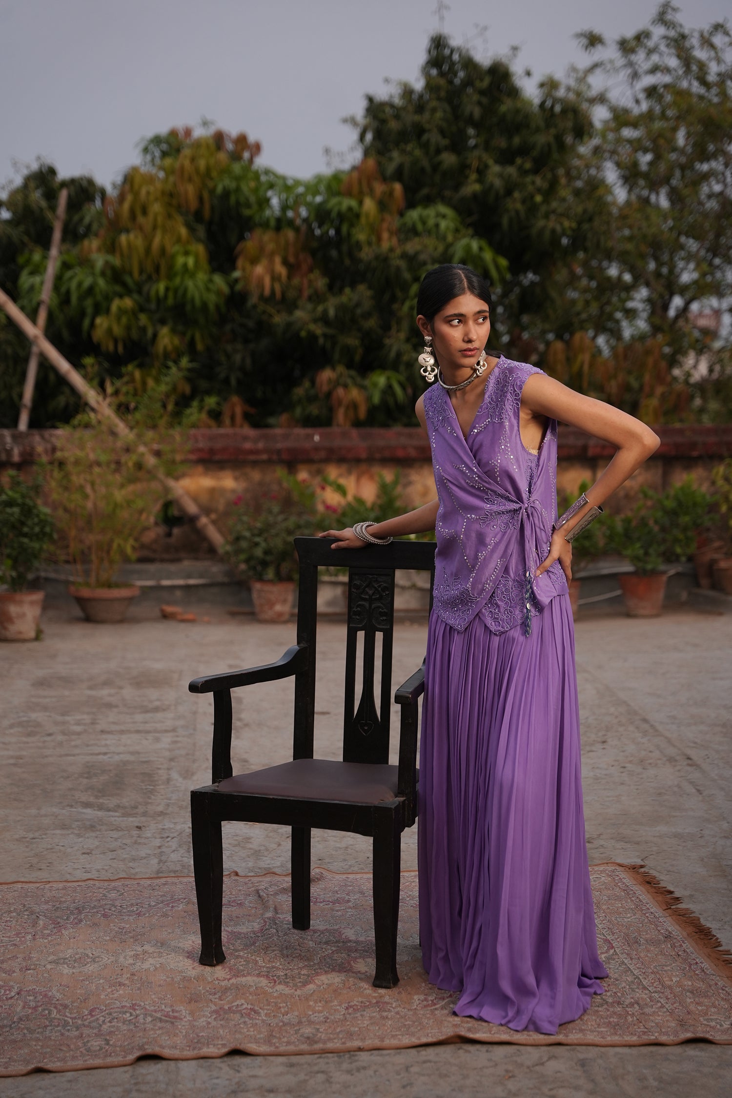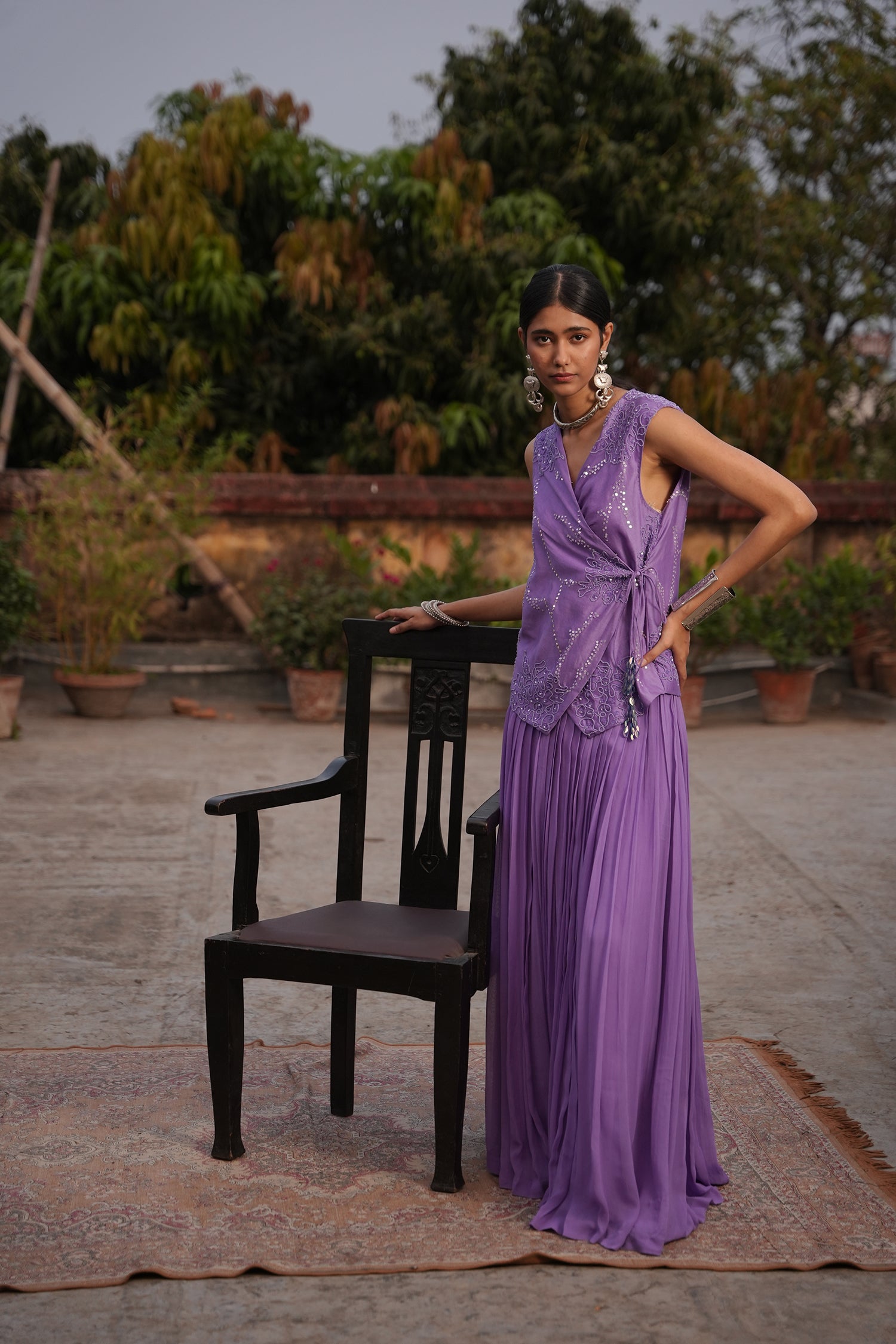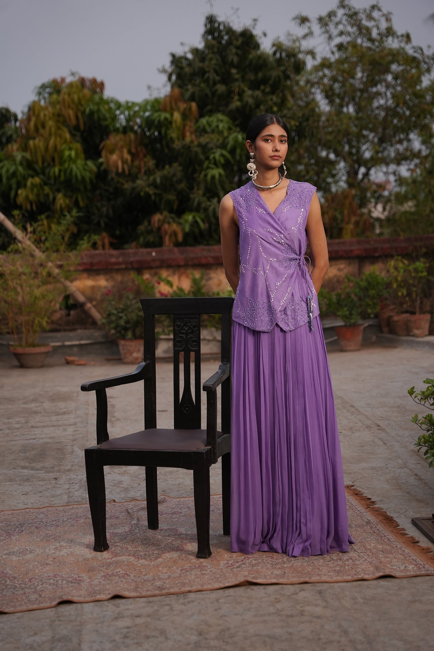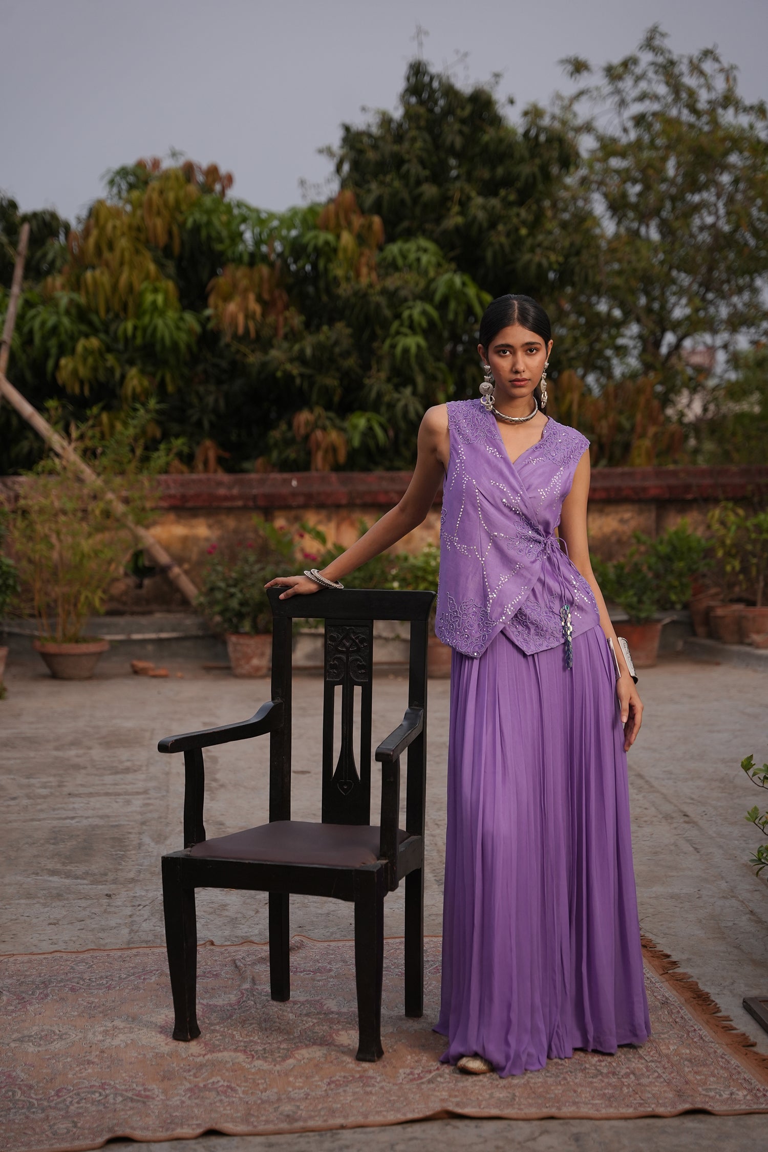 Aafia Amethyst Shade Georgette Pleated Skirt With Silk Chanderi Overlap Jacket