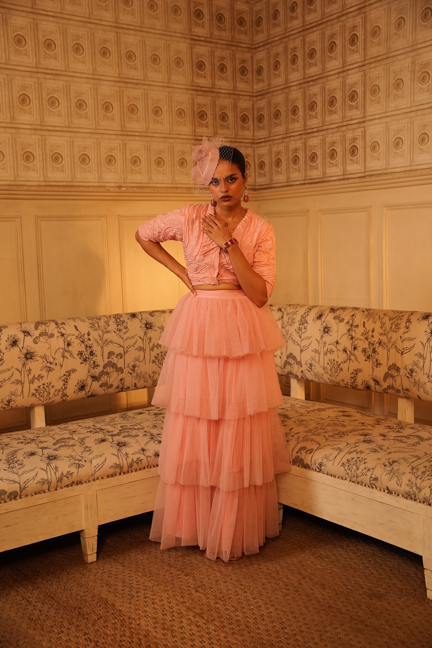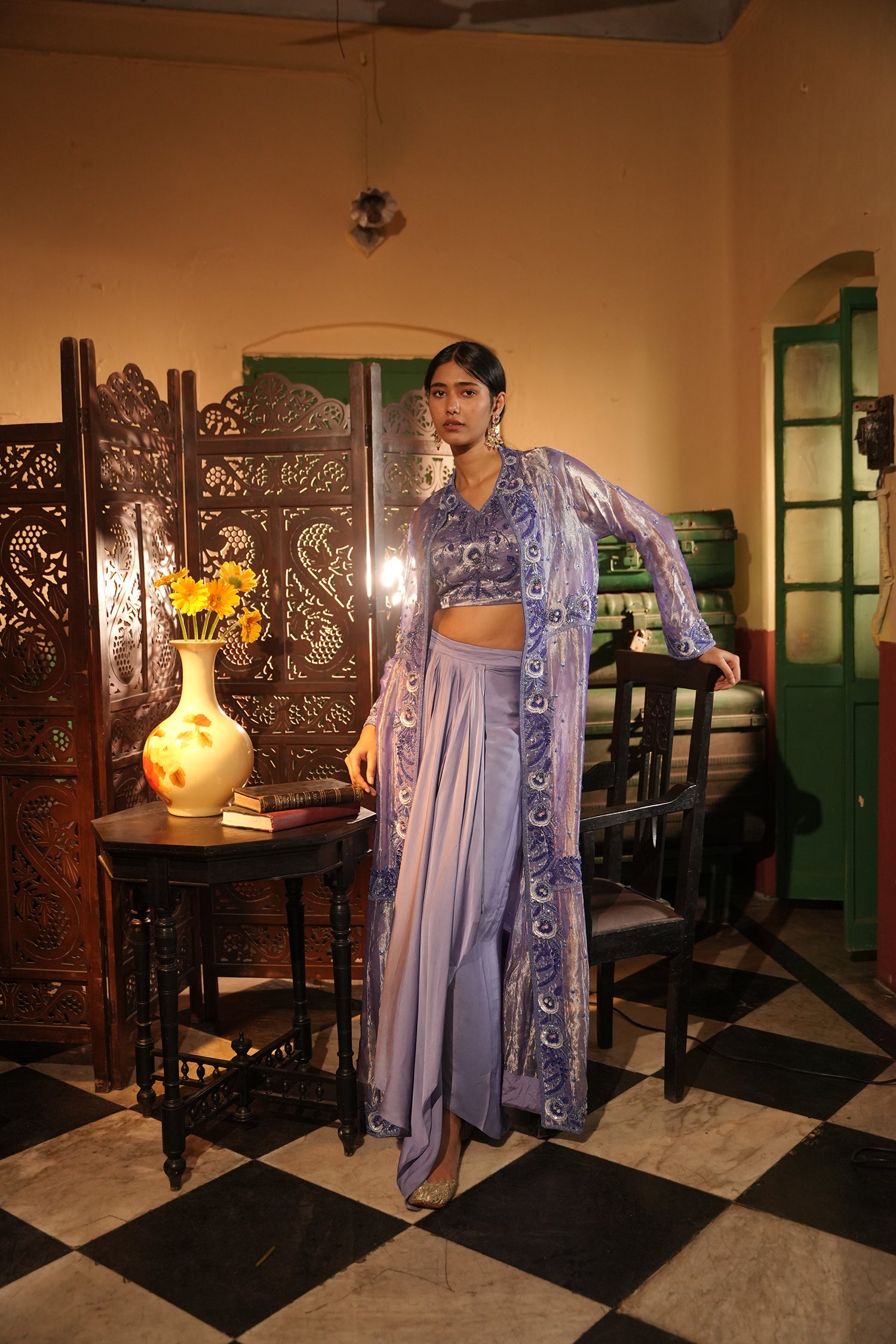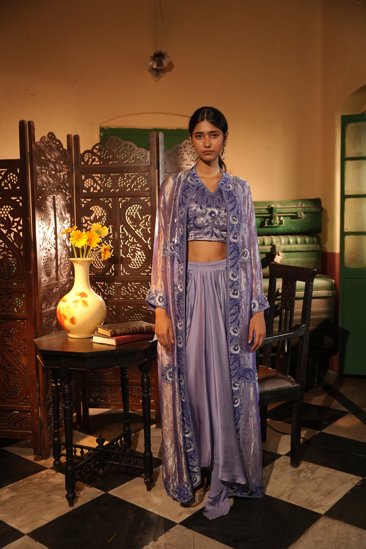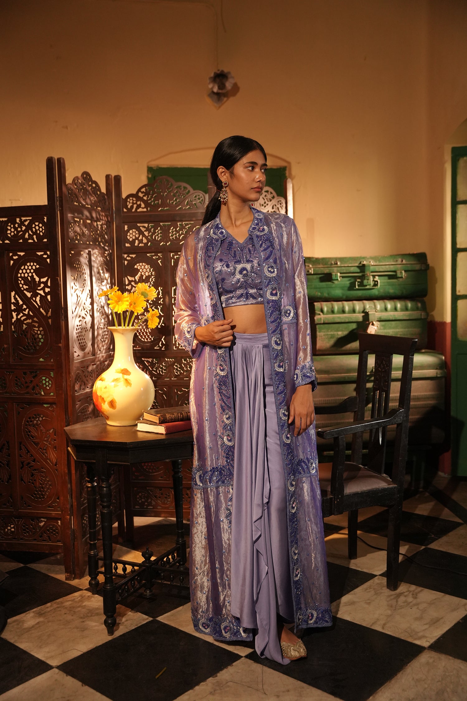 Aafia Amethyst Shade Georgette Pleated Skirt With Silk Chanderi Overlap Jacket