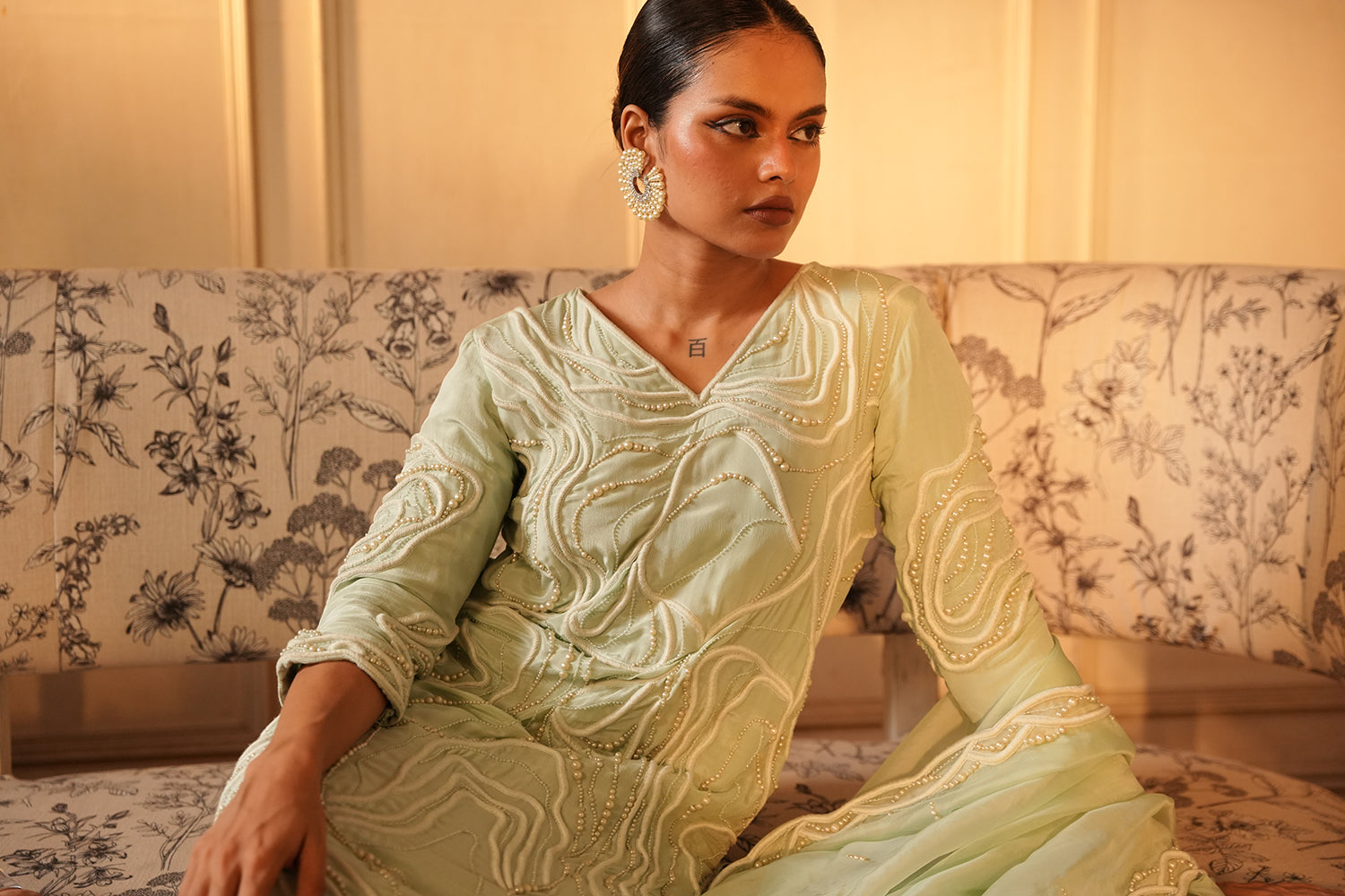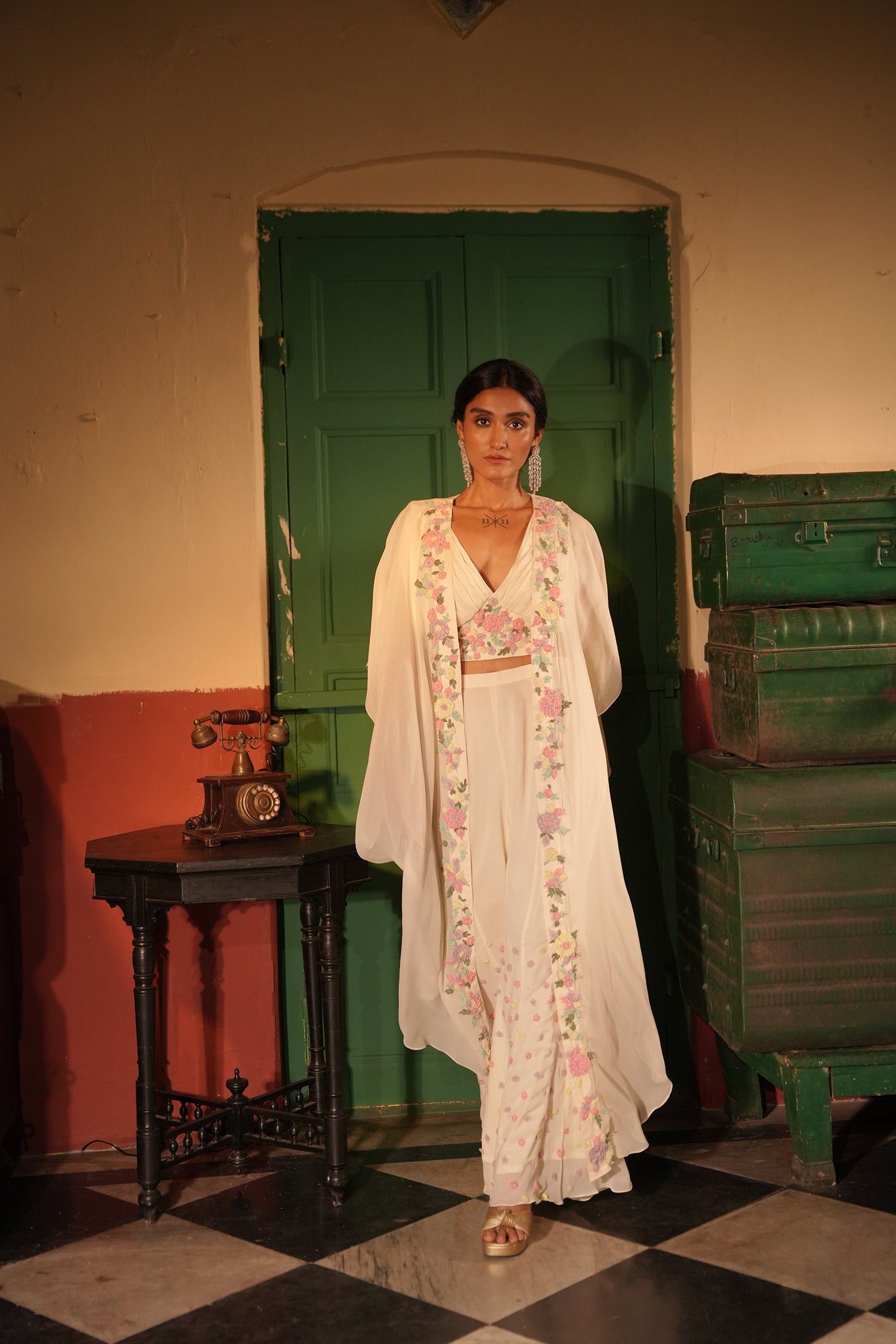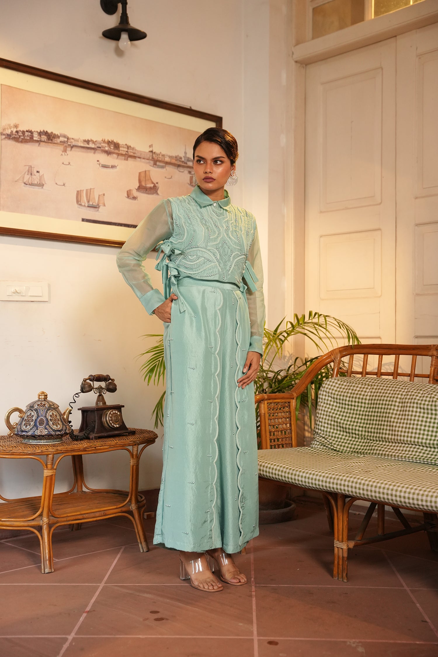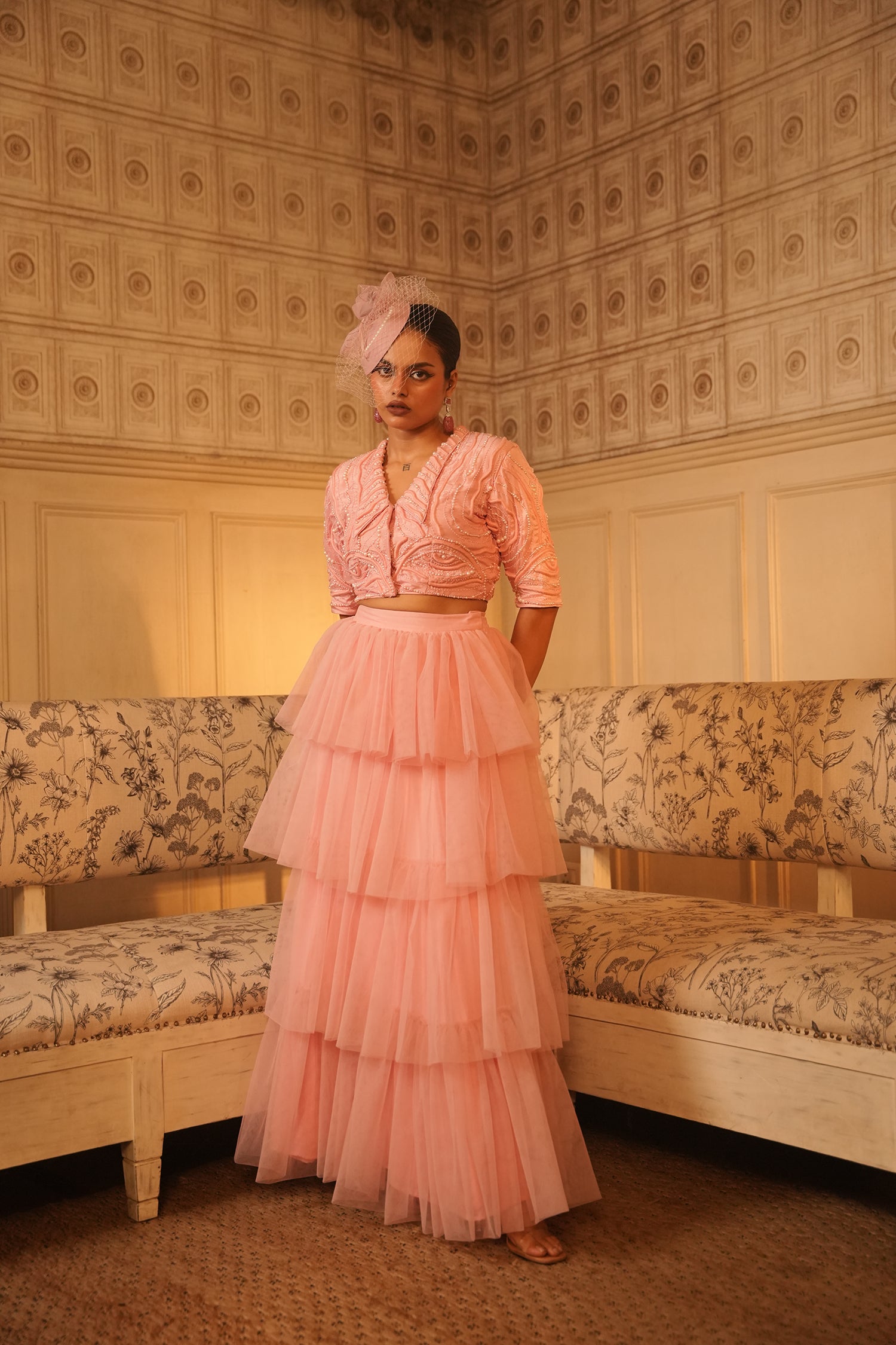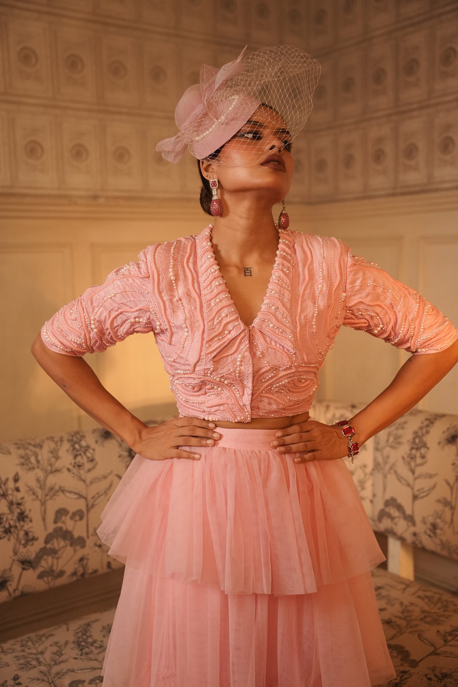 Aafia Amethyst Shade Georgette Pleated Skirt With Silk Chanderi Overlap Jacket