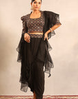 Black ajrakh blouse embellished with pure cutdana paired up with the drape dhoti skirt in pure natural crepe and dupatta in pure organza