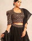 Black Ajrakh Embellished Blouse With Drape Skirt And Ruffle Dupatta