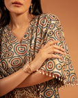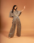 Featuring comfy ajrak printed jumpsuit with fully heavy embellished with cutdana, moti and rhinestone beadwork flap and brotch.