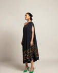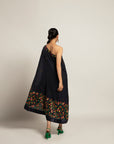Featuring Deep blue one shoulder single umbrella organza dress with intricate detailing of multicolored cutdana penetration work with tangy orange and fuscia pink crystal beads hangings