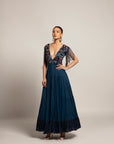 Featuring Six layered cobalt blue ankle length gown in georgette with cutdana fringe detailed sleeves and bodiac in mashru silk is heavily embellished with cutdana penetration work