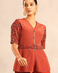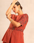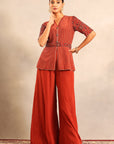 Red Ajrakh Embroidered Runner Peplum Top With Pants