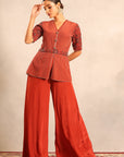 Venetian red peplum jacket in pure natural crepe embellished with cutdana and runner stitchwork paired up with pants