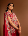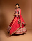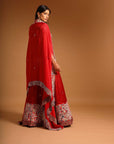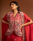 Featuring cherry red lehenga in fully embroidered resham, cutdana work teamed with long koti jacket with attached embroidered duppata in cape style in pure satin crepe
