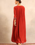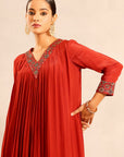 Scarlet red embellished neckline gathered kurta in pure natural crepe paired up with straight pants in pure natural crepe with embellished ajrakh border