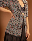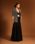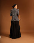 Featuring fully embellished ajrakh jacket with cutdana and beadwork with inner paired up with the black flared skirt in pure satin crepe