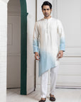 Elevate your festive wardrobe with this refined ivory-sky kurta set. The sherwani features a seamless gradient of ivory transitioning into serene sky blue, adorned with delicate floral embroidery that exudes grace and sophistication. The modern mandarin collar and clean silhouette are complemented by an asymmetrical layered kurta, adding a touch of contemporary charm. Paired with classic white trousers, this ensemble is a perfect choice for engagements, receptions, and festive celebrations, offering a blend of elegance and modernity.