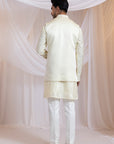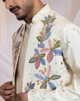 The Nehru with intricate multicolored thread embroidery in floral and foliage motifs, primarily on the front panels. The embroidery includes chain stitch and French knots with beads , pipes and sequins work on it. Ideal for festive and wedding wear.