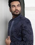 A sophisticated midnight blue bandhgala crafted with intricate floral embroidery that exudes elegance and refinement. The rich detailing across the jacket adds a touch of opulence, while the structured silhouette ensures a regal and tailored fit. Perfect for formal events, weddings, and festive occasions, this ensemble is designed to make a lasting impression. Pair it with matching trousers or churidars to complete the royal look.