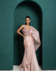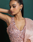 Radiate grace with the Blush Elegance Drape Set, a perfect fusion of modernity and tradition. This ensemble features a delicately embellished sleeveless blouse with shimmering sequins, exuding refined charm. The flowing blush-hued draped skirt with soft pleats and layers adds a touch of romantic sophistication. The look is completed with a matching pleated dupatta for an effortlessly chic vibe. Ideal for weddings, receptions, or festive gatherings, this outfit ensures you stand out with timeless elegance and contemporary flair.