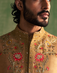 Three-piece set featuring a Bandi with intricate floral embroidery, paired with a kurta showcasing backstitch and pintuck detailing on hem and cuff, and finished with ivory pants.