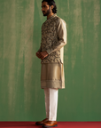 Three-piece set featuring a Bandi with intricate floral embroidery, paired with a kurta showcasing backstitch and pintuck detailing on hem and cuff, and finished with ivory pants.