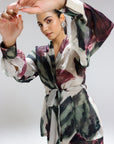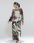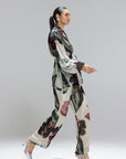 This jacket shirt set will be everything this summer evening. Digitally printed in a muted yet striking wine print in an exaggerated print . Paired with elasticated straight pants for a glam look!