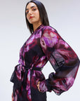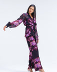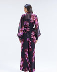 This jacket shirt set will be everything this summer evening. Digitally printed in a muted yet striking wine print in an exaggerated print . Paired with elasticated straight pants for a glam look!