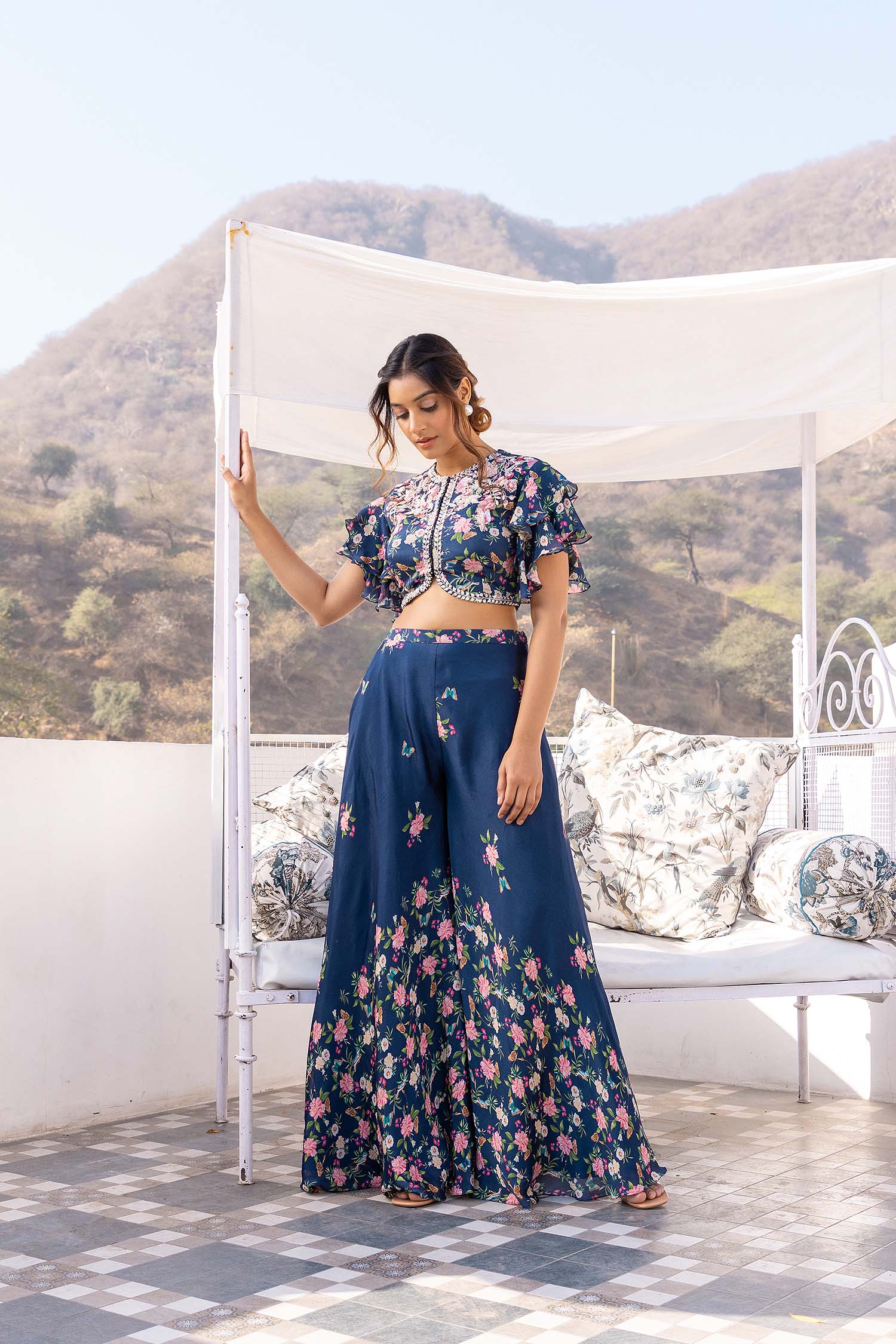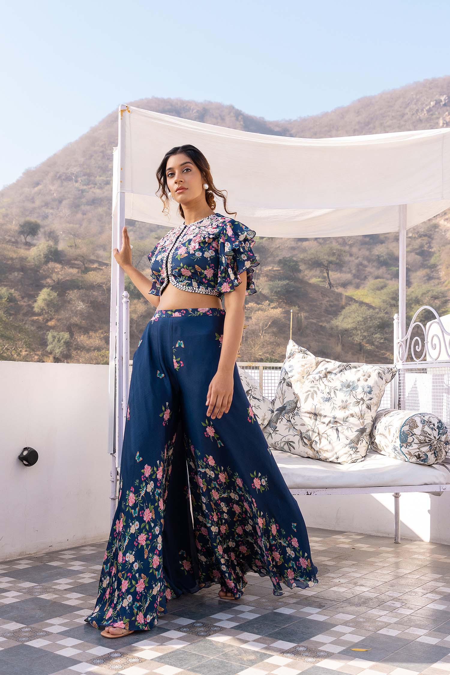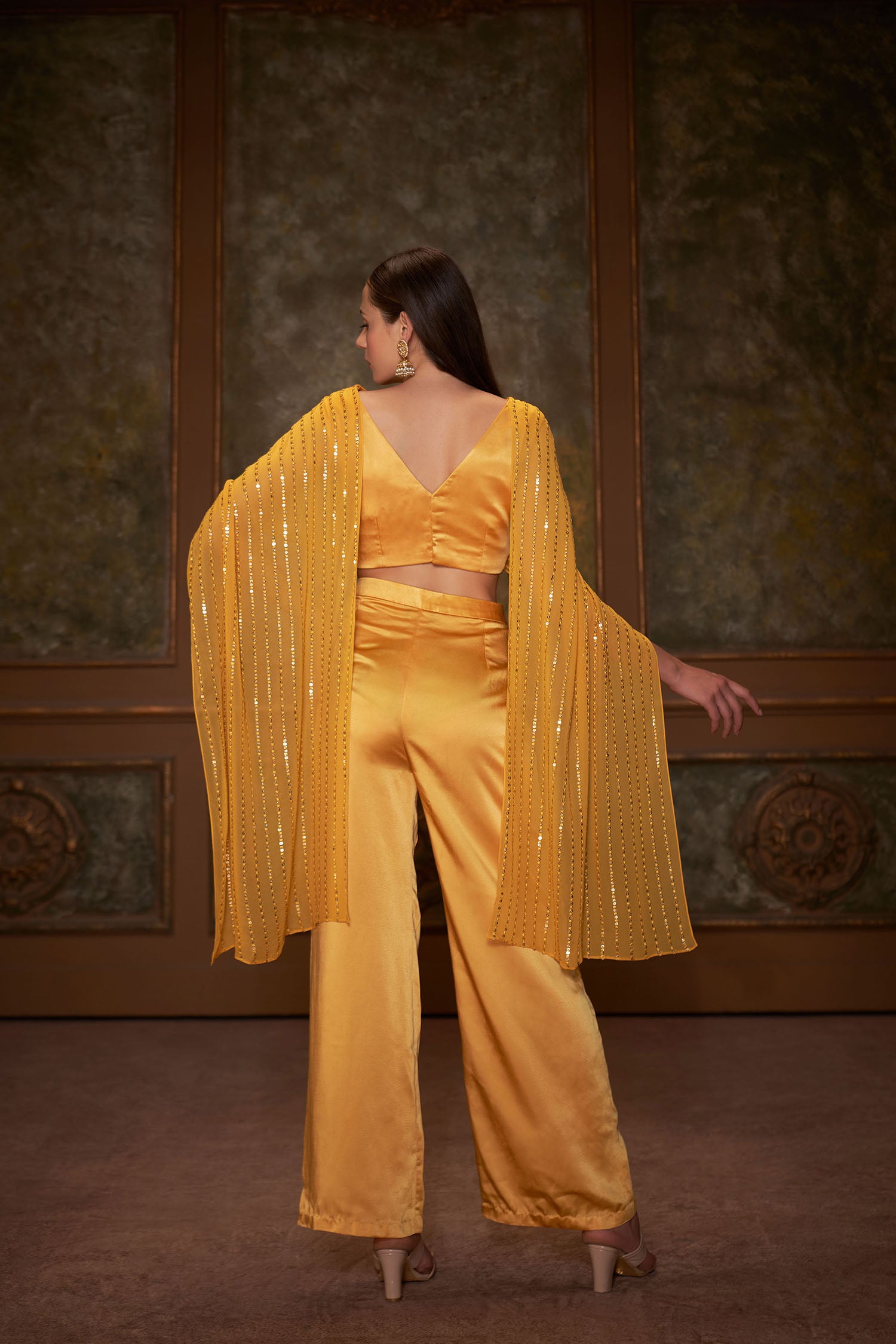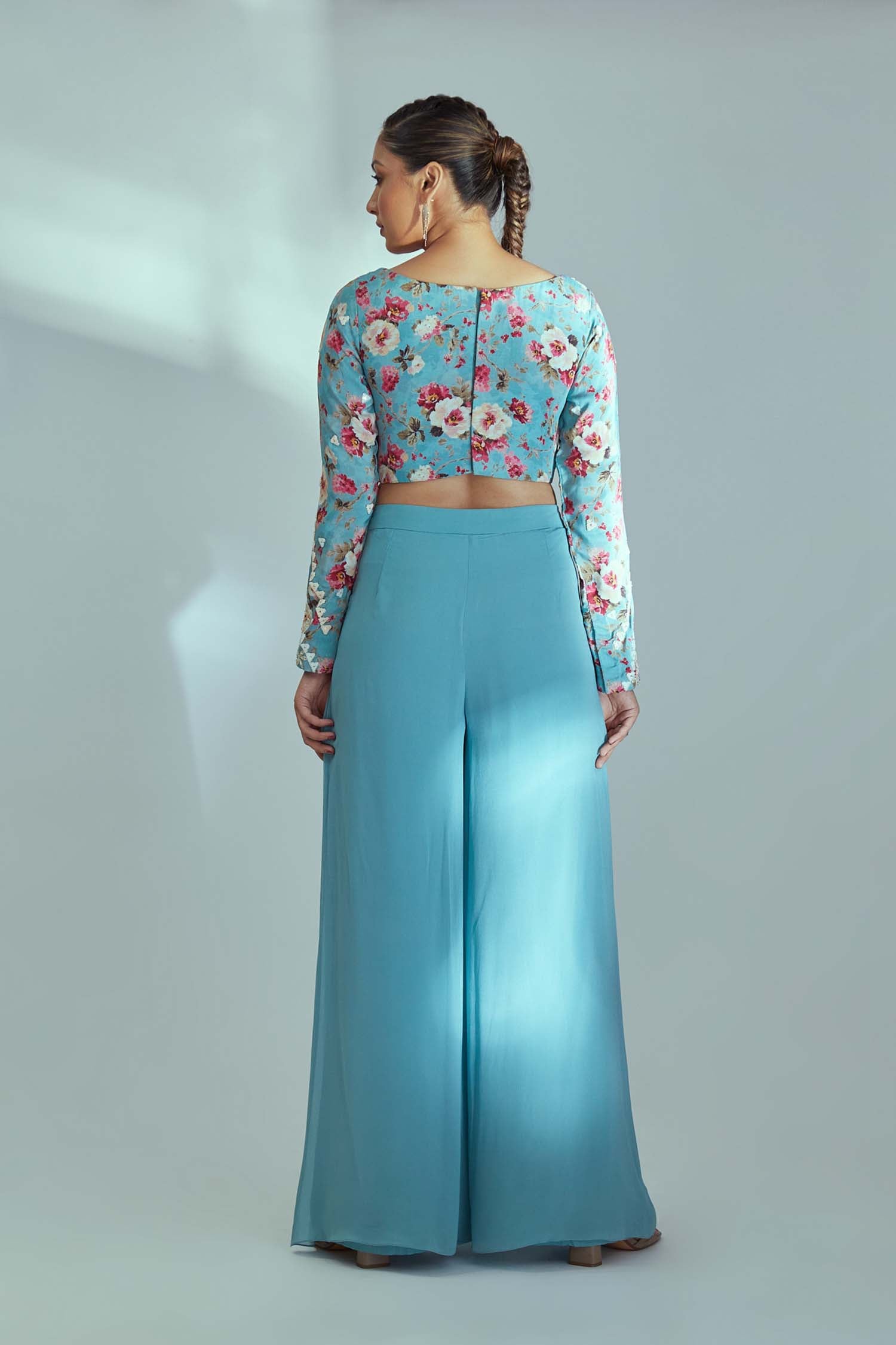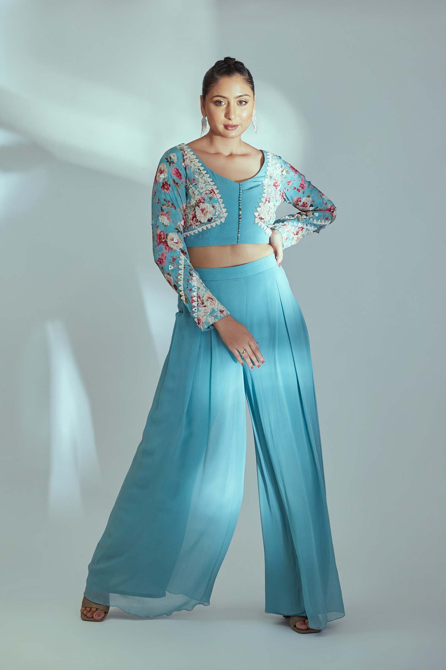 Crop Top and Flared Pants Fusion Set with Sequin Embroidery
