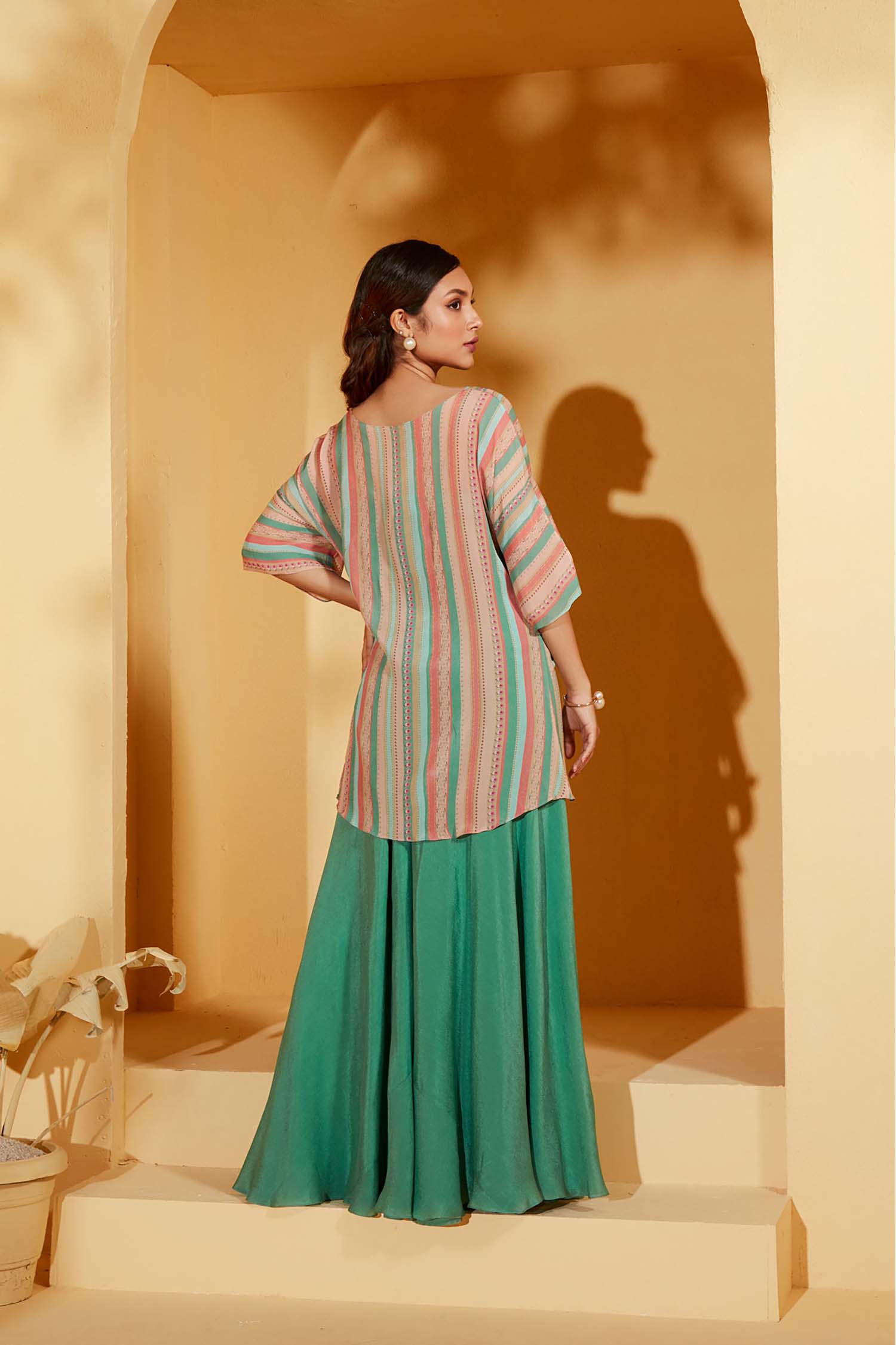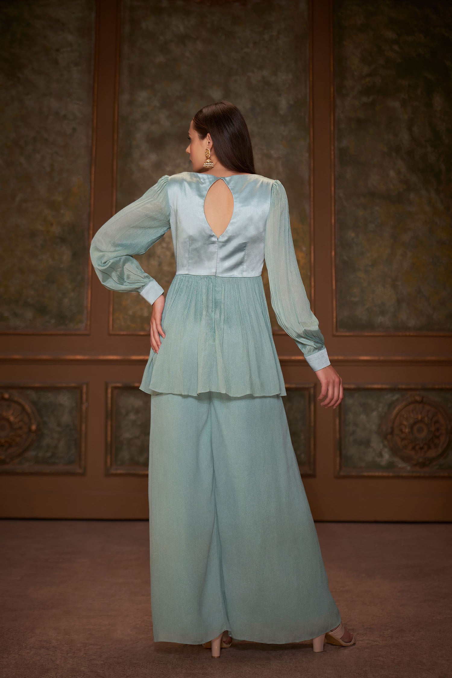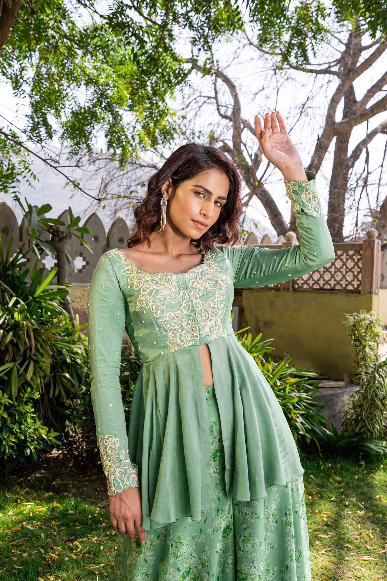 Mint Green Drape Skirt Set with Ruffle Dupatta and Crepe-Organza Fabric